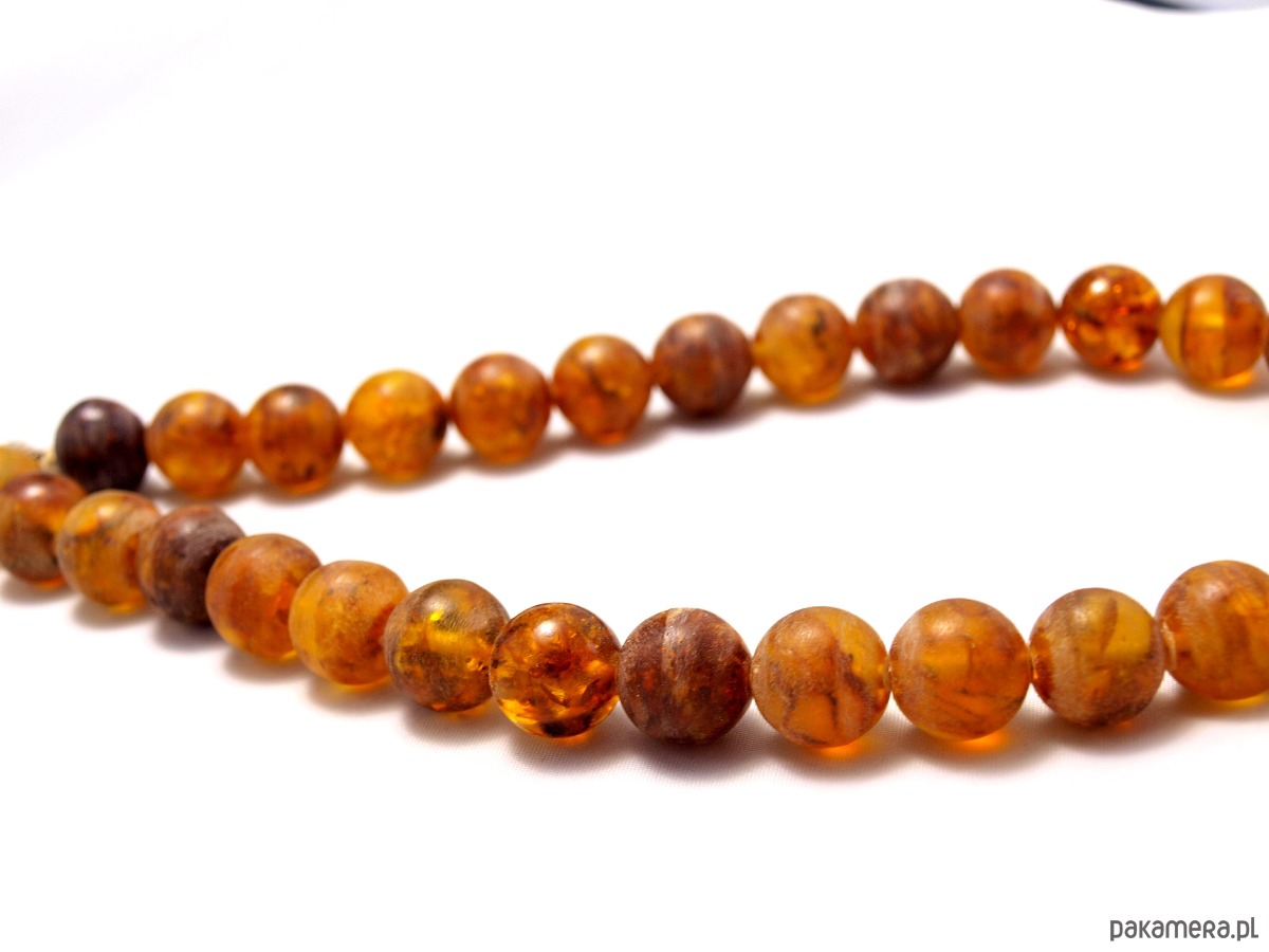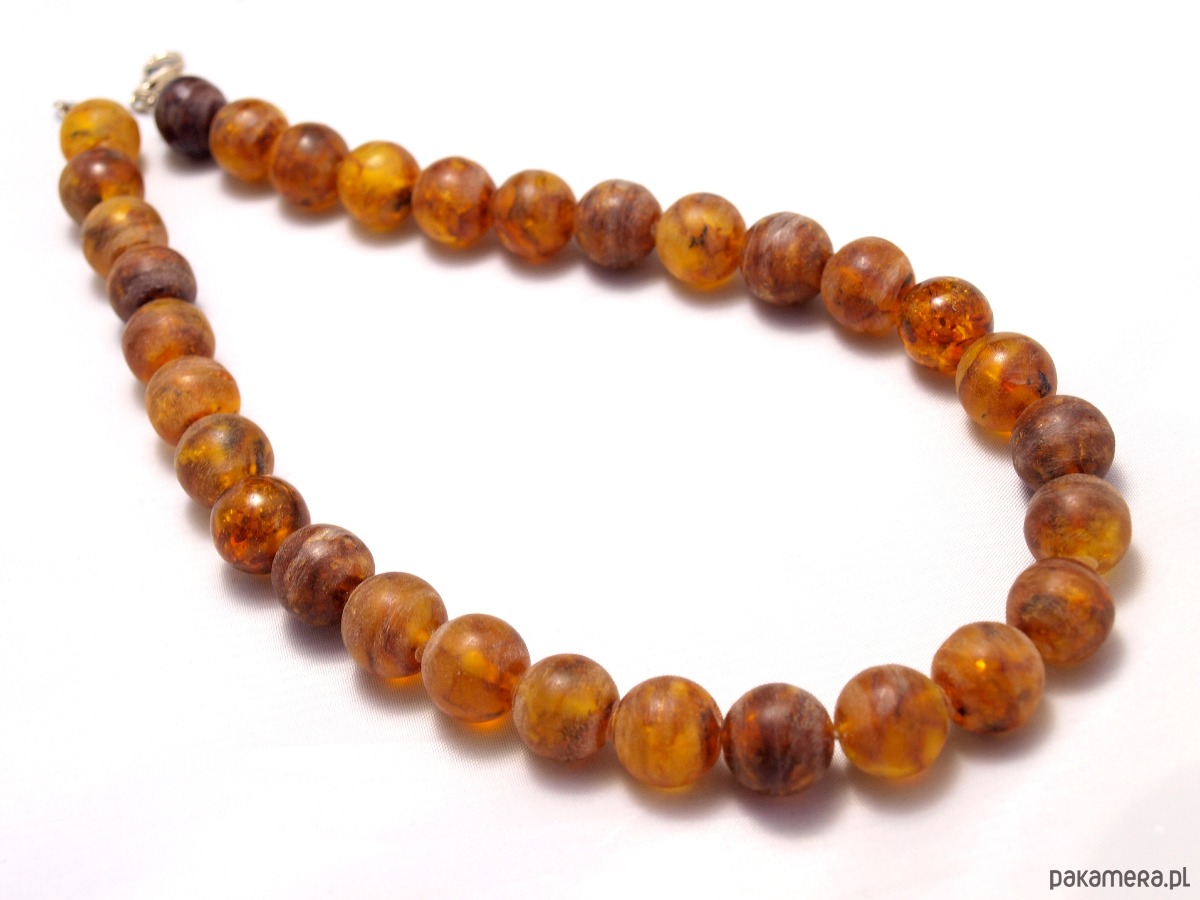 Korale wykonane z bursztynu bałtyckiego. Długość - 45 cm, srebrne zapięcie.