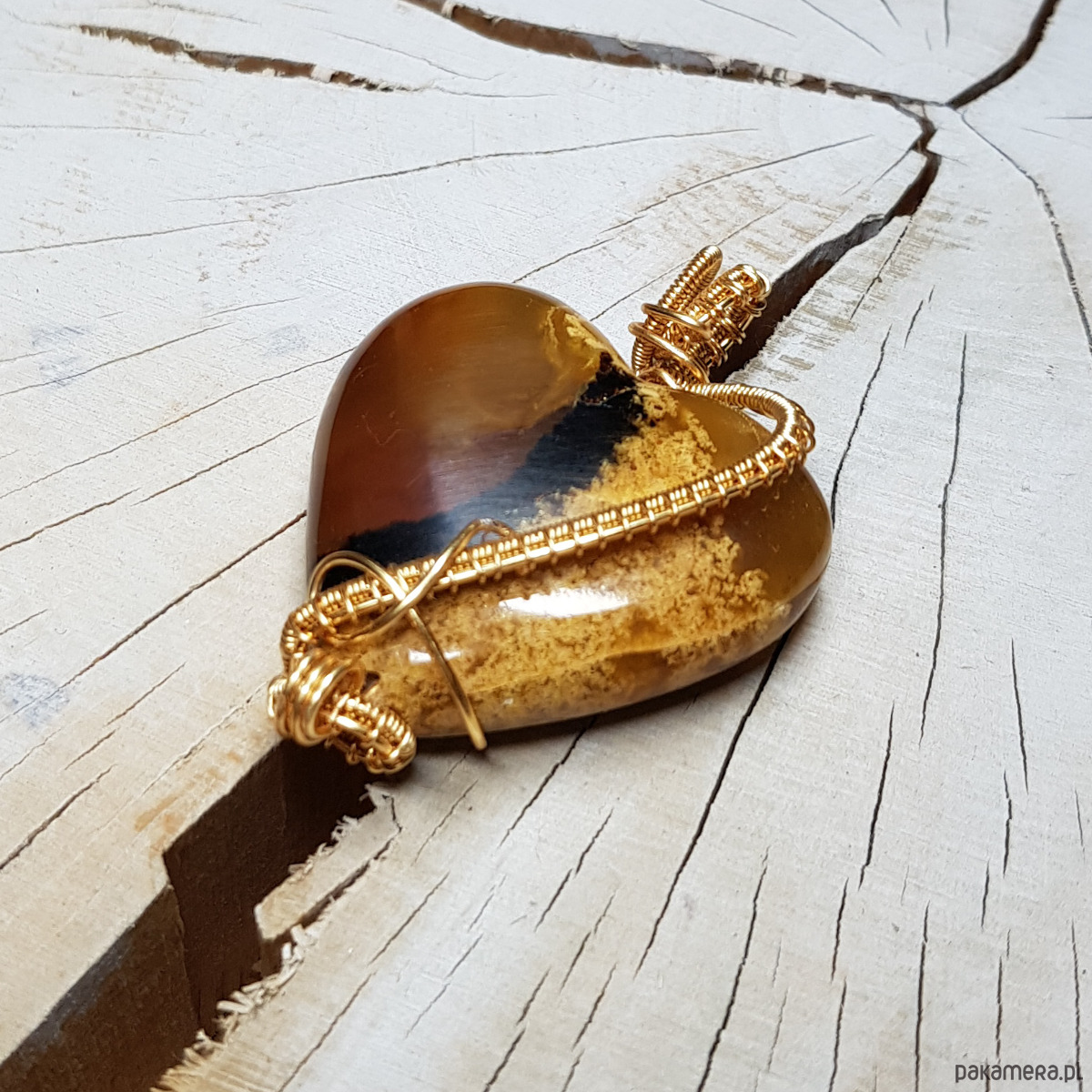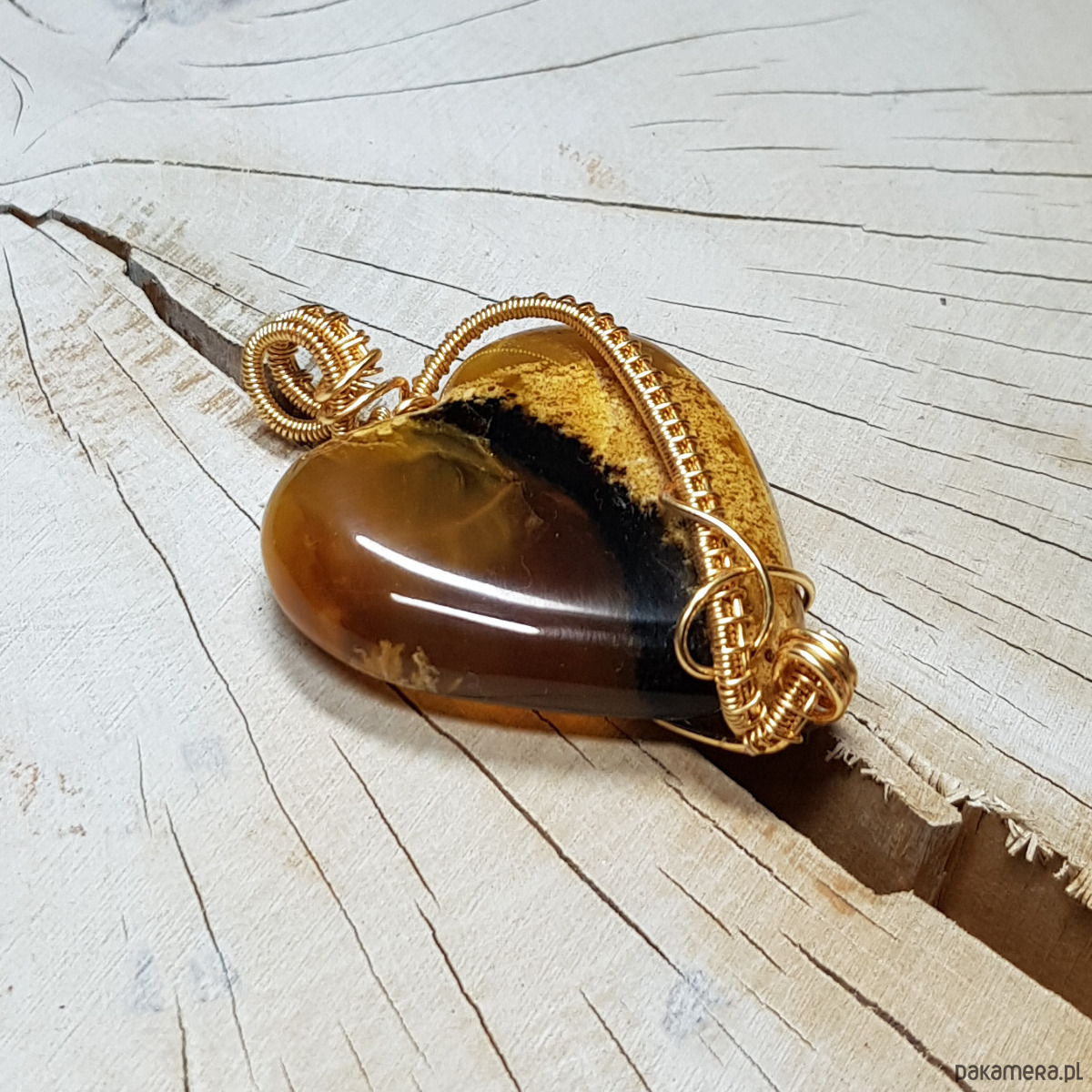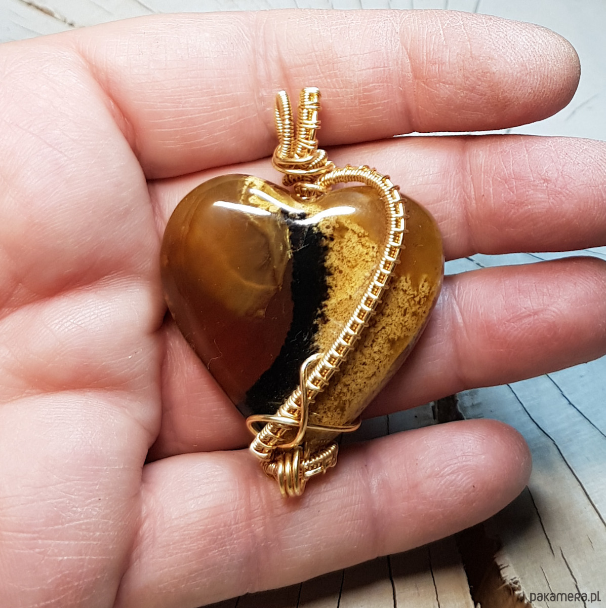 Zawieszka wykonana ręcznie metodą wire-wrappingu której głównym elementem jest serce z bursztynu z Sumatry. Do wykonania wisiorka użyłam miedzianego drutu pokrytego warstwą w kolorze GOLD zabezpieczającą przed ciemnieniem. Wymiary zawieszki 53x37mm , bez łańcuszka.