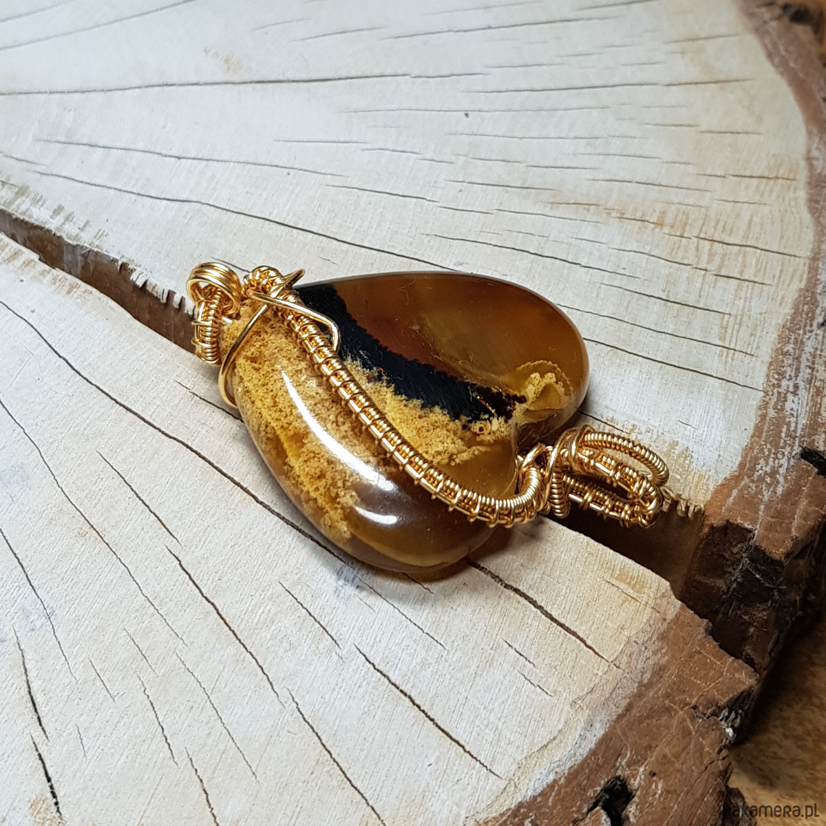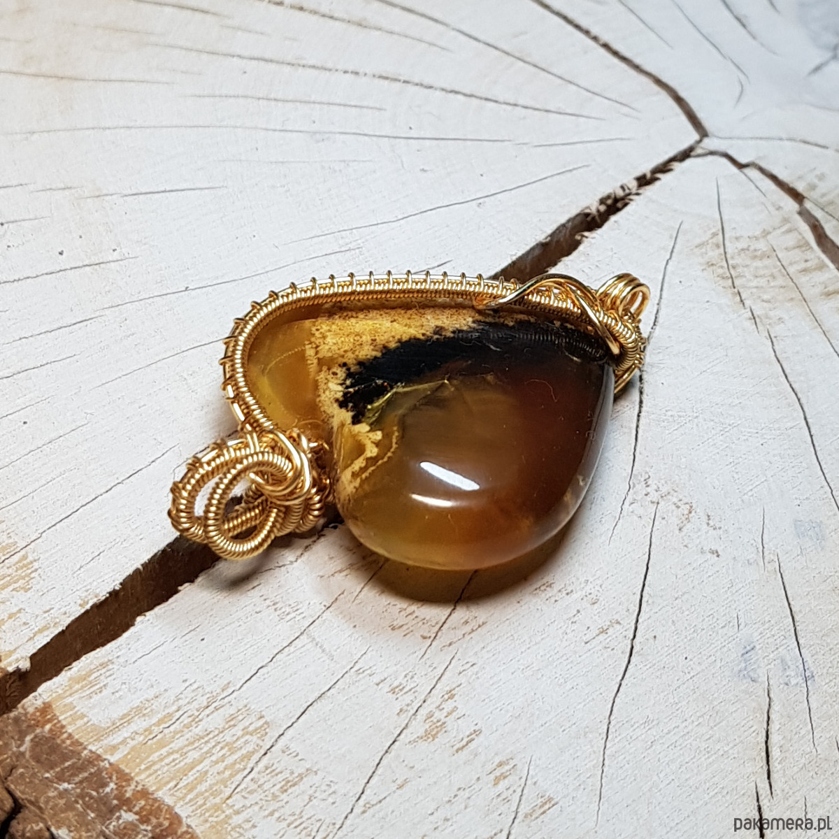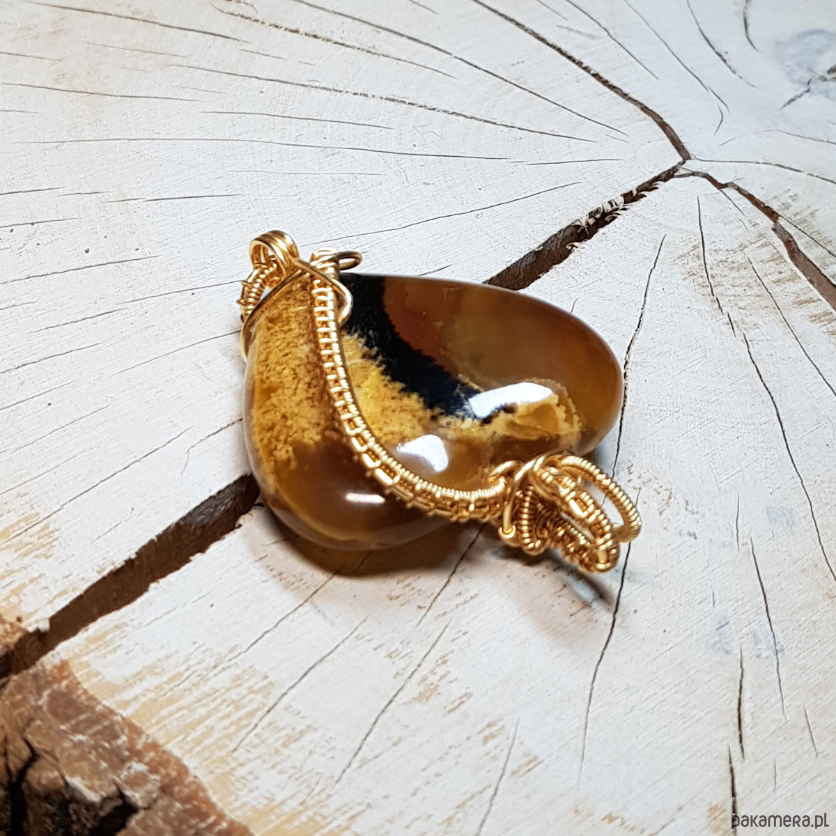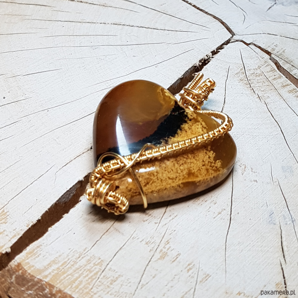 Zawieszka wykonana ręcznie metodą wire-wrappingu której głównym elementem jest serce z bursztynu z Sumatry. Do wykonania wisiorka użyłam miedzianego drutu pokrytego warstwą w kolorze GOLD zabezpieczającą przed ciemnieniem. Wymiary zawieszki 53x37mm , bez łańcuszka.