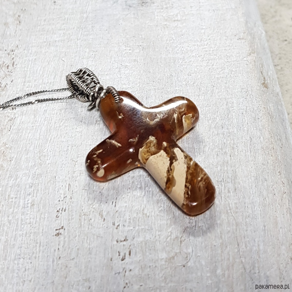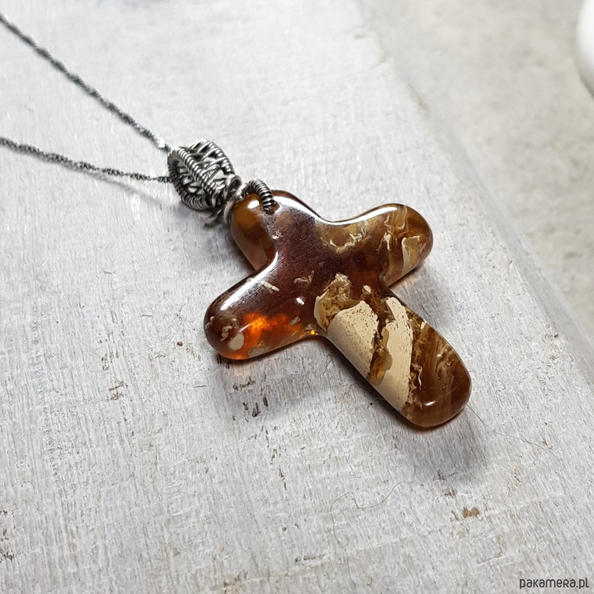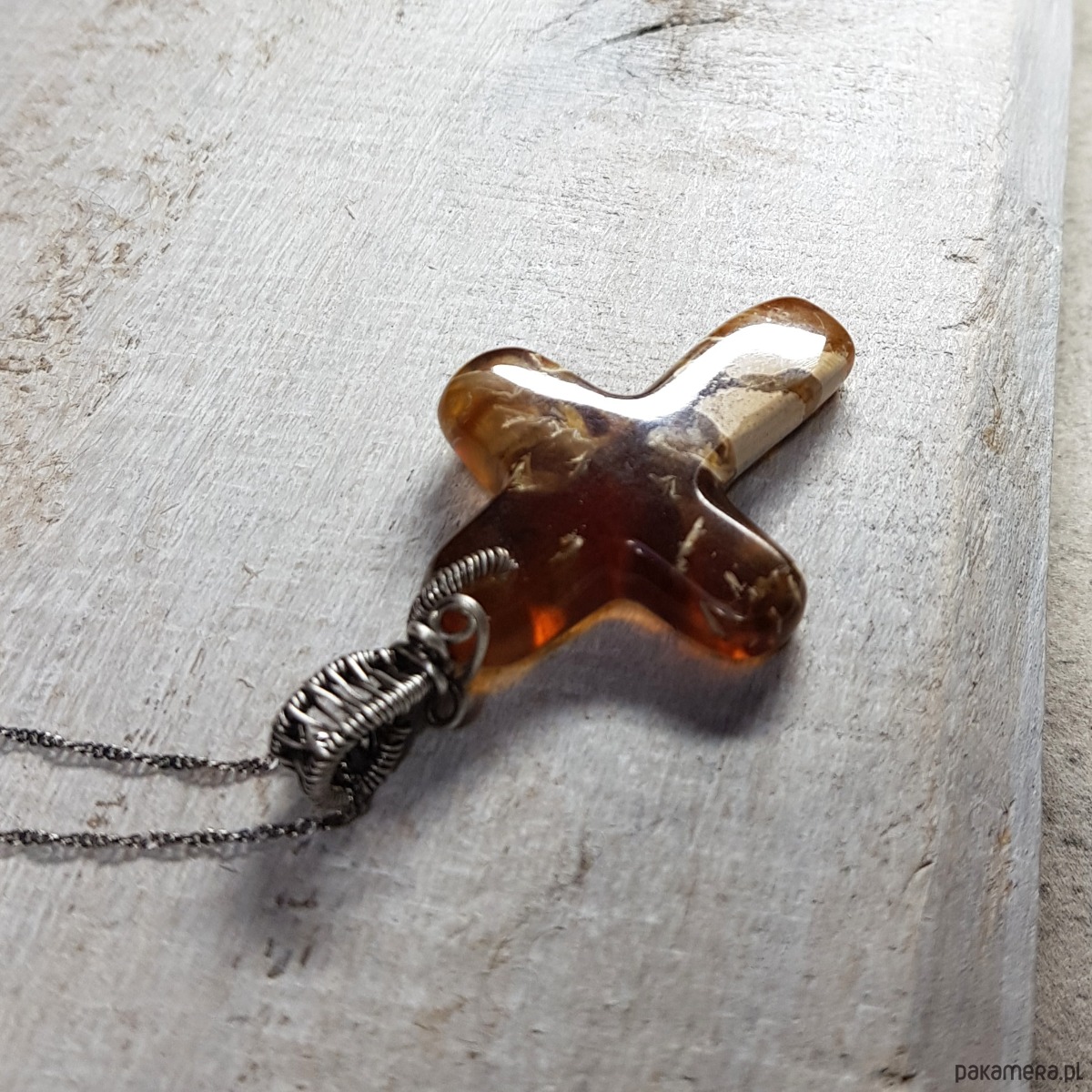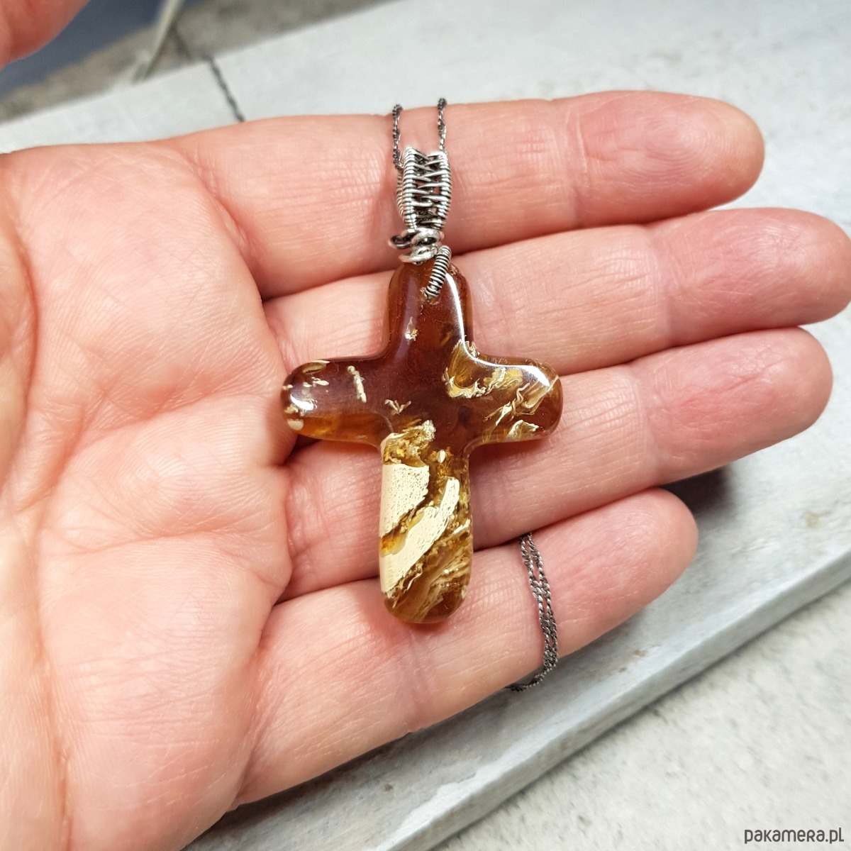 Zawieszka wykonana ręcznie metodą wire-wrappingu której głównym elementem jest krzyżyk wypolerowany z bryłki naturalnego bursztynu w pięknych koniakowych i piaskowych barwach wzajemnie się przenikających. Do wykonania wisiorka użyłam srebra najwyższej próby 999, które następnie zaoksydowałam i wypolerowałam w celu uzyskania szlachetnego efektu postarzenia. Wymiary zawieszki 53x31mm (krzyżyk 40x31) z delikatnym łańcuszkiem widocznym na zdjęciu długości około 48-50 cm.