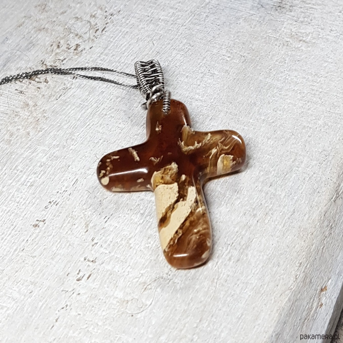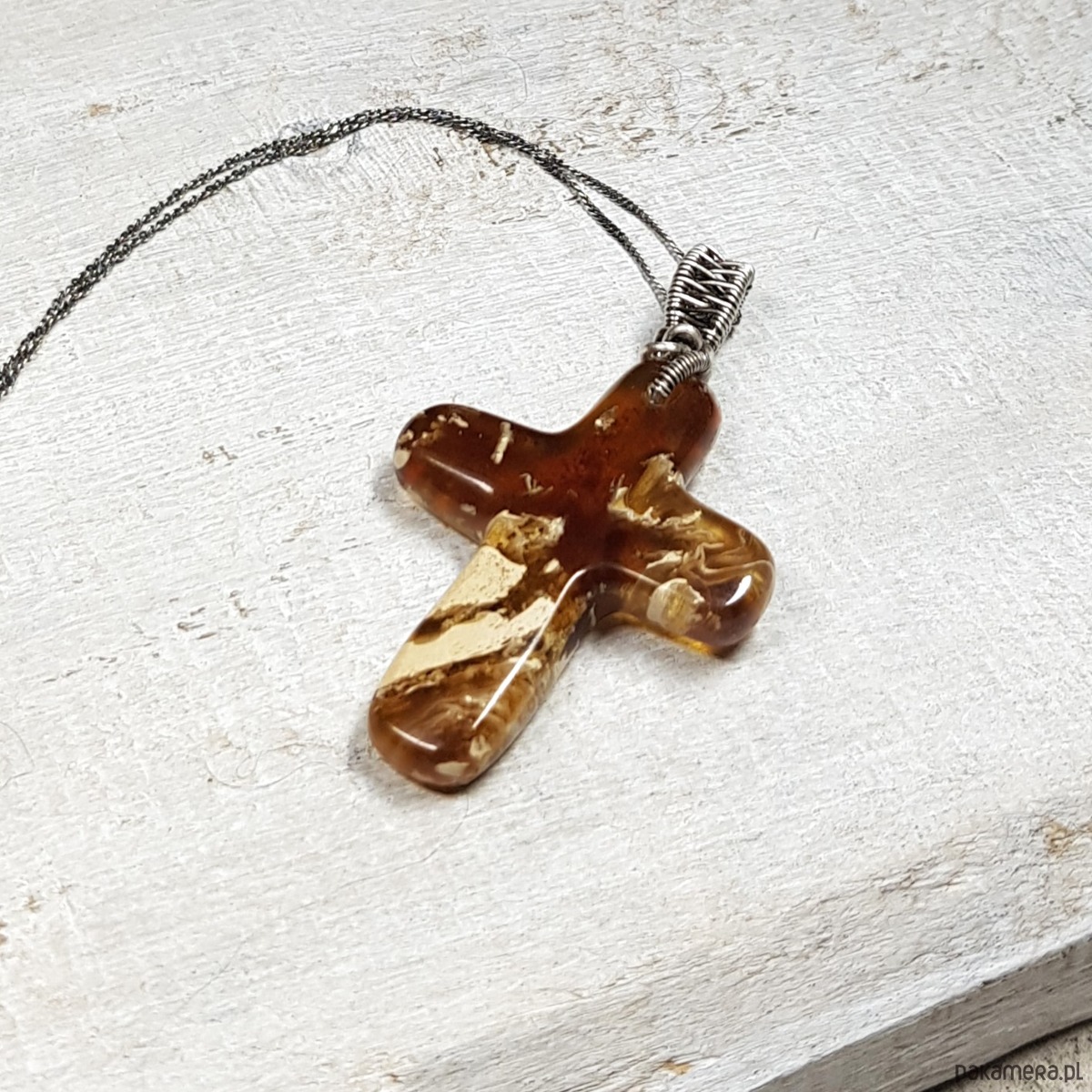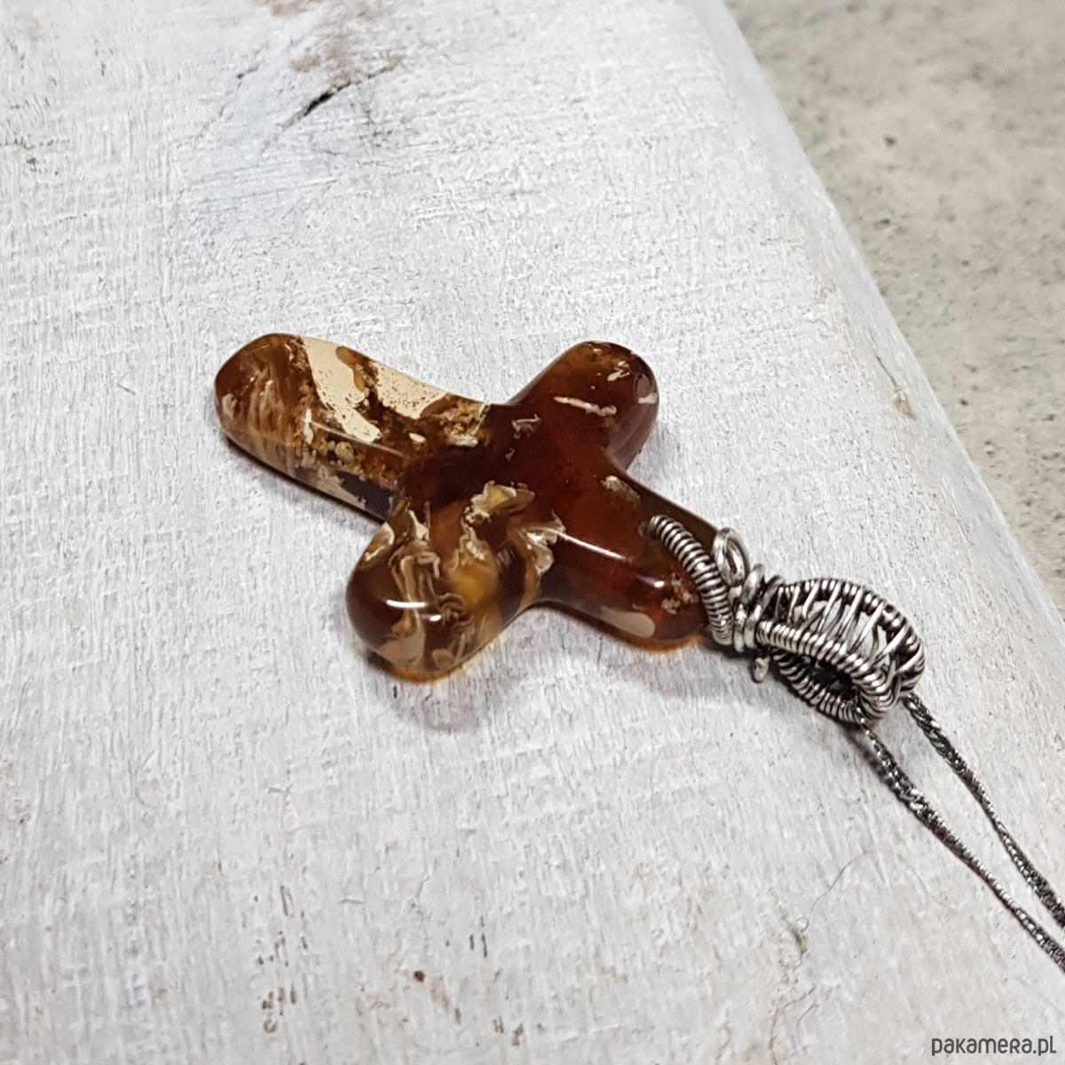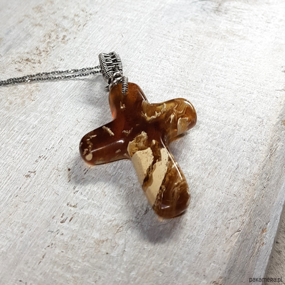 Zawieszka wykonana ręcznie metodą wire-wrappingu której głównym elementem jest krzyżyk wypolerowany z bryłki naturalnego bursztynu w pięknych koniakowych i piaskowych barwach wzajemnie się przenikających. Do wykonania wisiorka użyłam srebra najwyższej próby 999, które następnie zaoksydowałam i wypolerowałam w celu uzyskania szlachetnego efektu postarzenia. Wymiary zawieszki 53x31mm (krzyżyk 40x31) z delikatnym łańcuszkiem widocznym na zdjęciu długości około 48-50 cm.