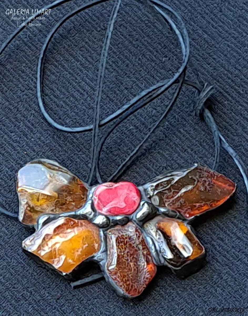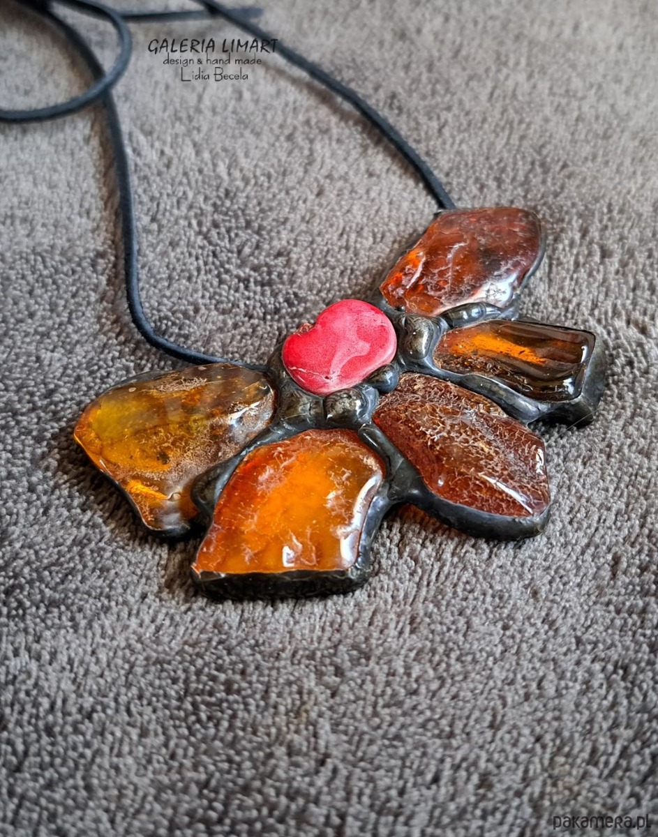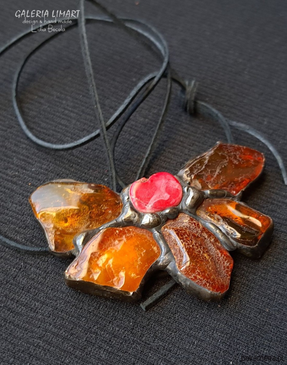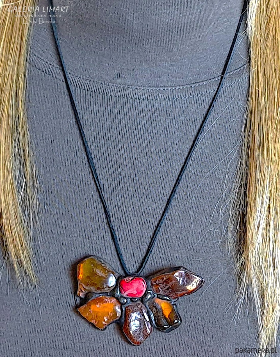 Bursztynowy kwiat z koralem UNIKATOWY wisior ręcznie robiony PREZENT