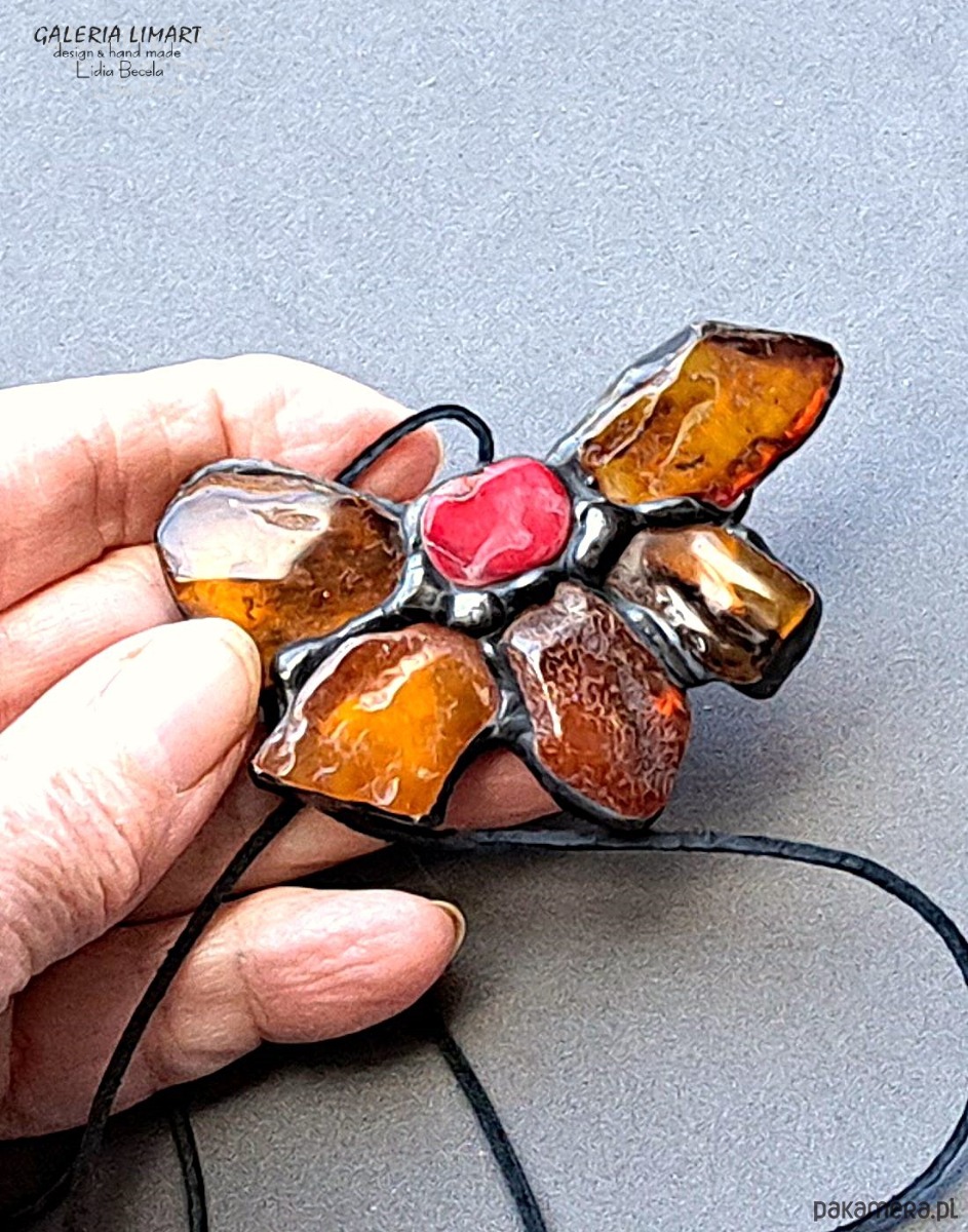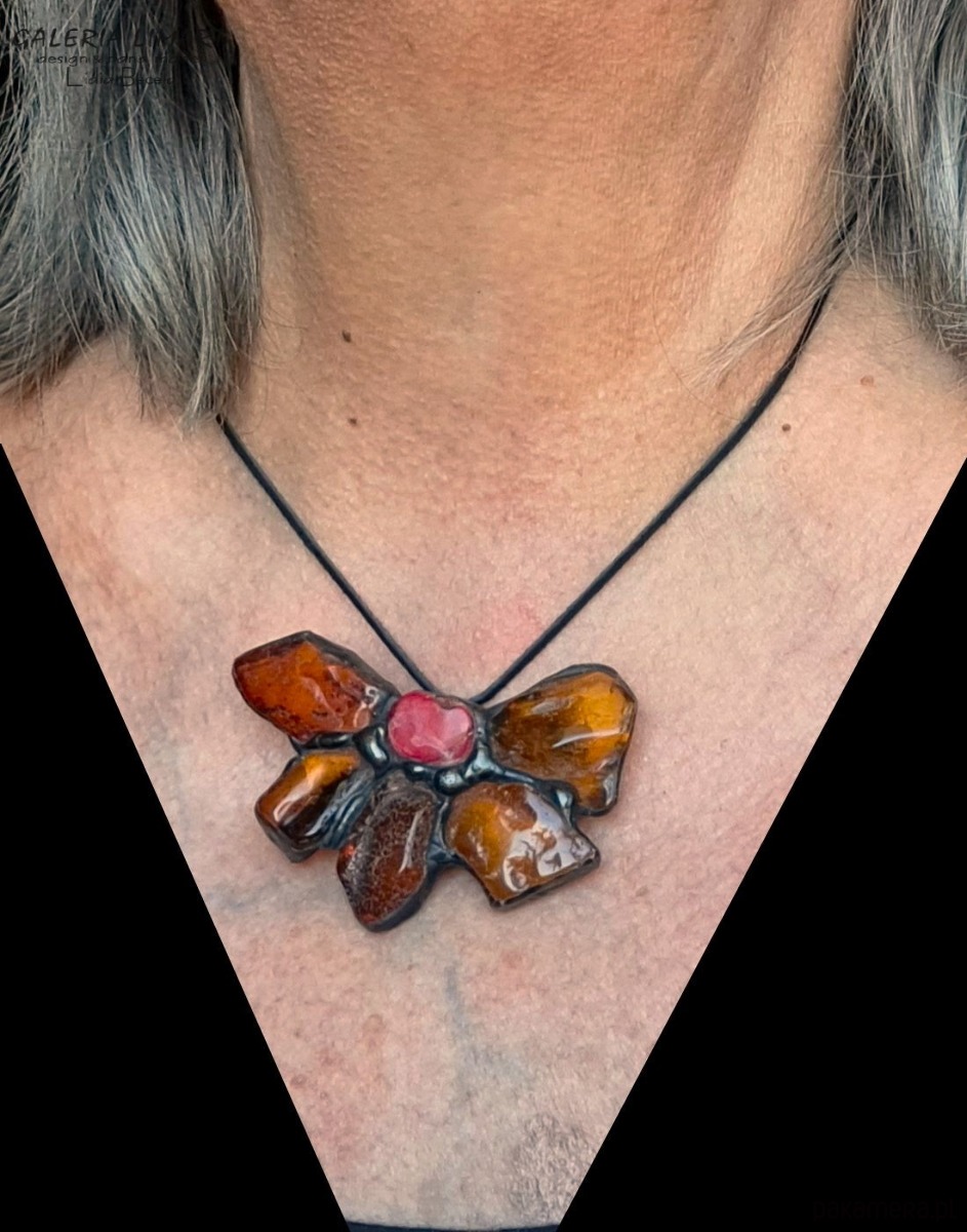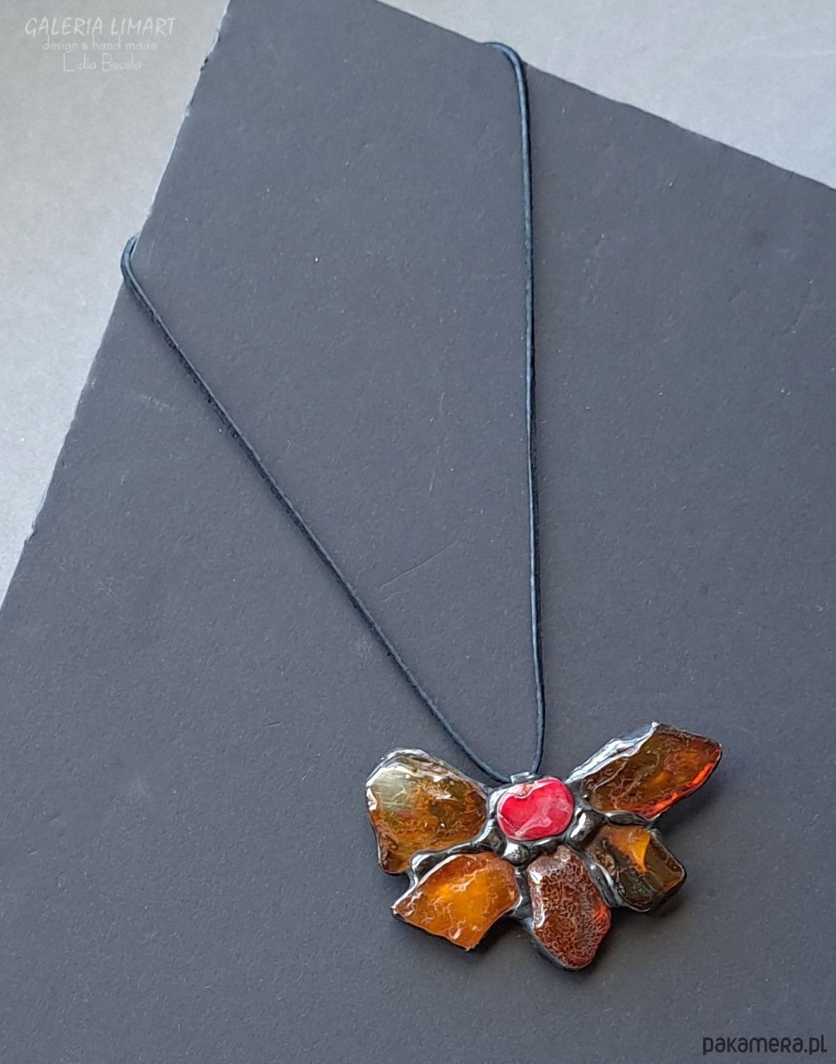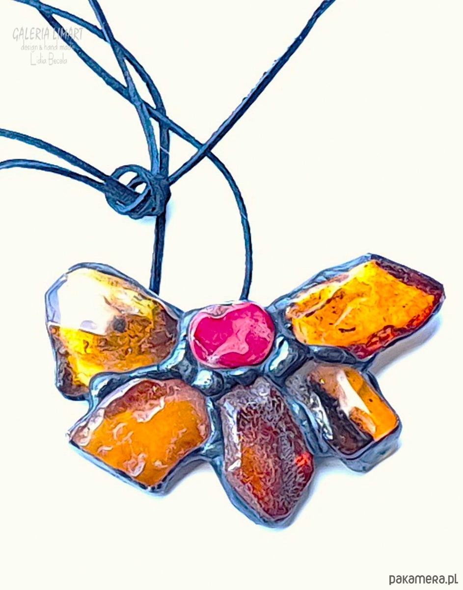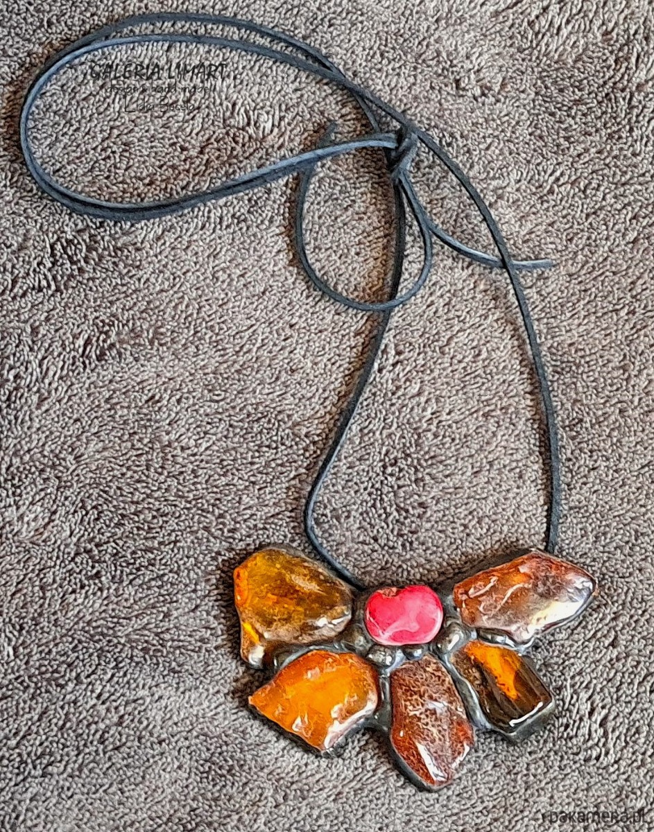 Bursztynowy kwiat z koralem UNIKATOWY wisior ręcznie robiony PREZENT