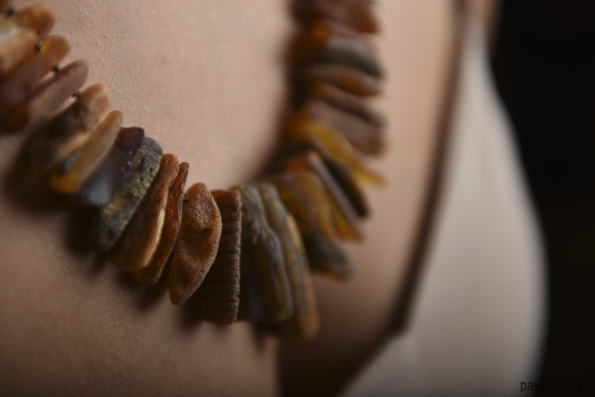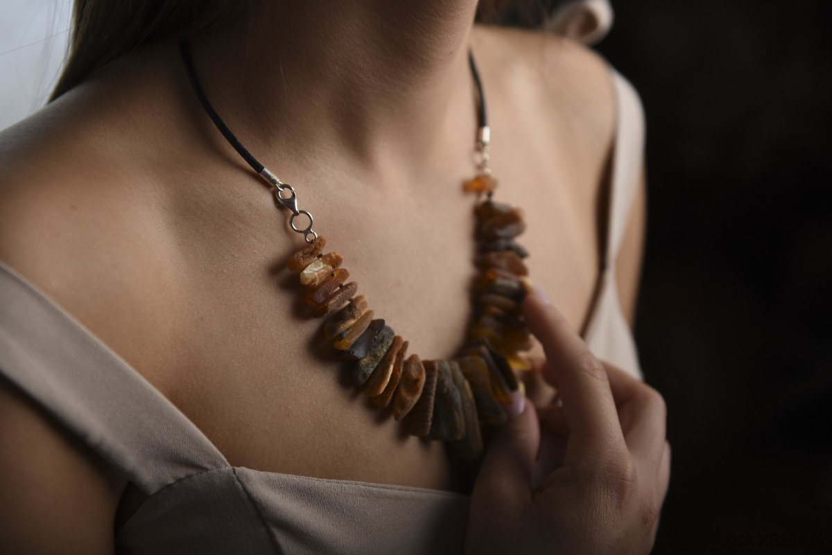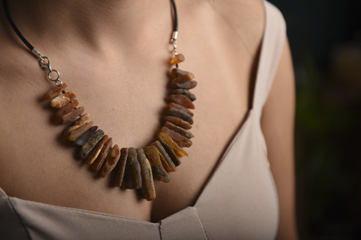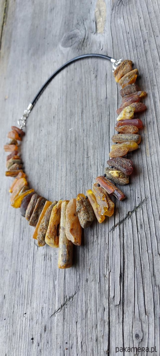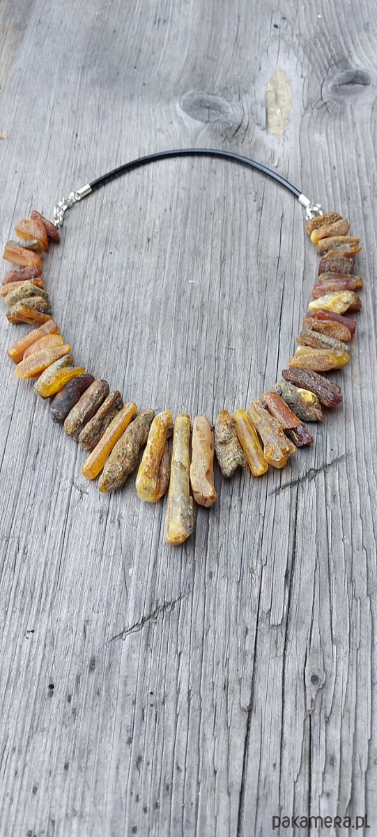 Naszyjnik bursztynowy z bryłek nie polerowany , na rzemieniu .