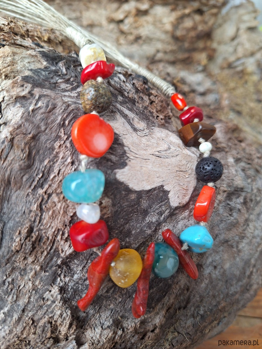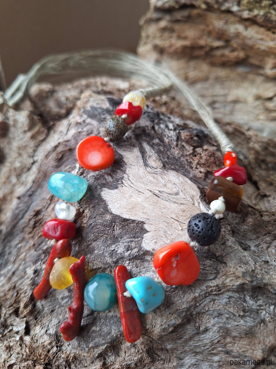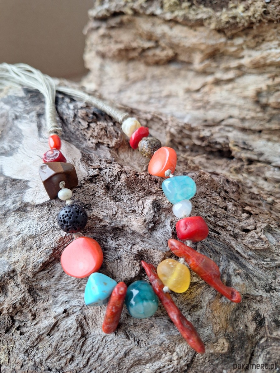 Naszyjnik z nici lnianych z miodowych bursztynem ,czerwonym koralem i pomarańczowym .agatem , turkusem,lawą