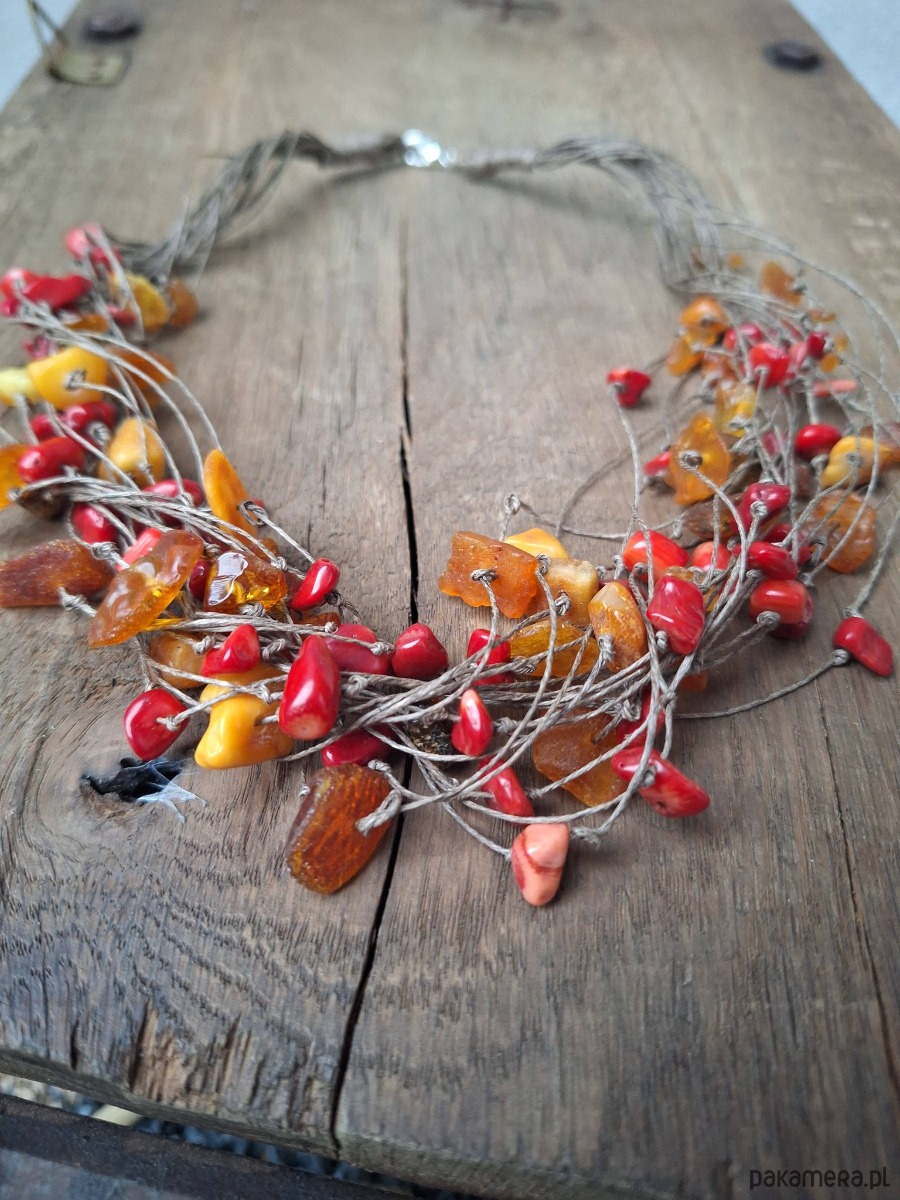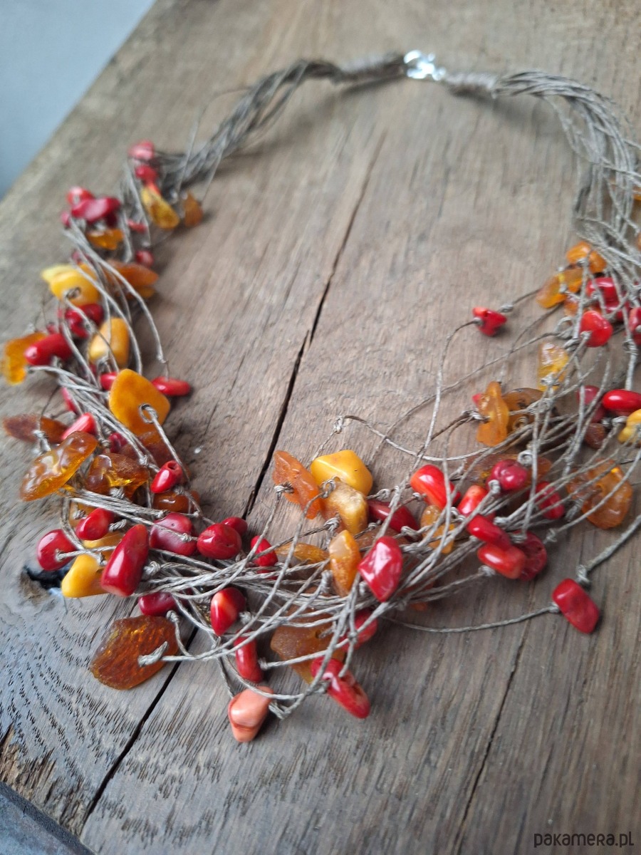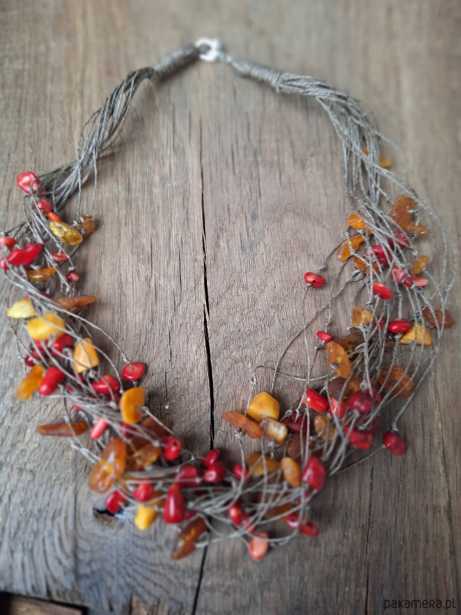 Nici lniane w kolorze zimistym z dodatkiem naturalnych bursztynów bałtyckich i czerwonego korala .