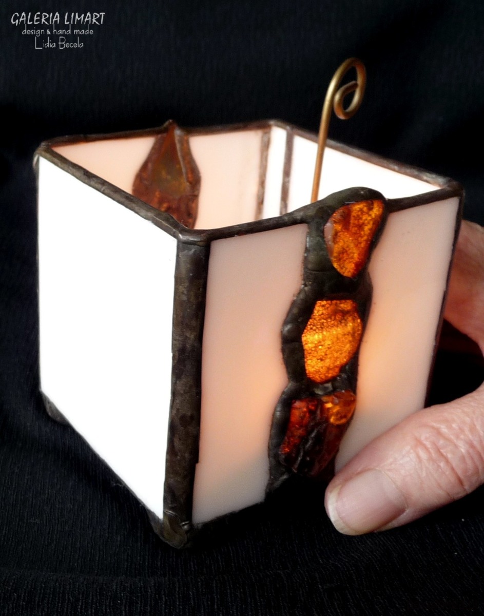 Autorski świecznik, a właściwie lampion ze szkła witrażowego najwyższego gatunku oraz 7 dorodnych bryłek bursztynu koniakowego, bardzo starannie wykonany plus szalenie wygodna "winda" :) do świeczki (nasz pomysł! po oparzeniu się w palec, w myśl zasady "potrzeba matką wynalazku" ;)
