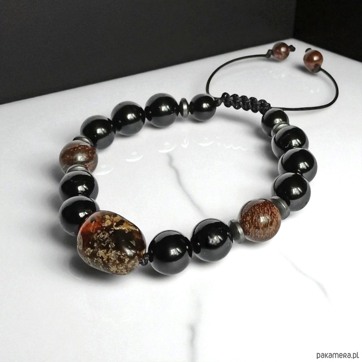 BURSZTYN,turmalin,bronzyt UNIKAT unikatowa bransoletka S-L