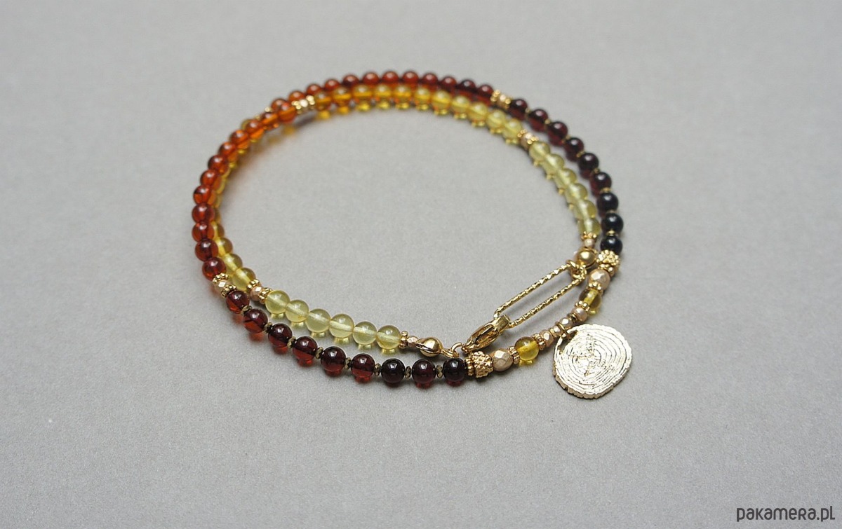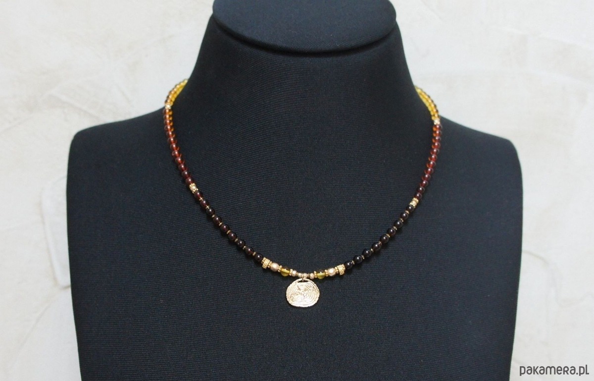 Krótki, delikatny naszyjnik wykonany w całości z pozłacanej stali szlachetnej, bursztynów [4mm], hematytów fasetowanych, platerowanych [2mm, 3mm i 4mm] oraz przekładek z hematytu [1mm]. Naszyjnik o długości ok. 44,5cm.