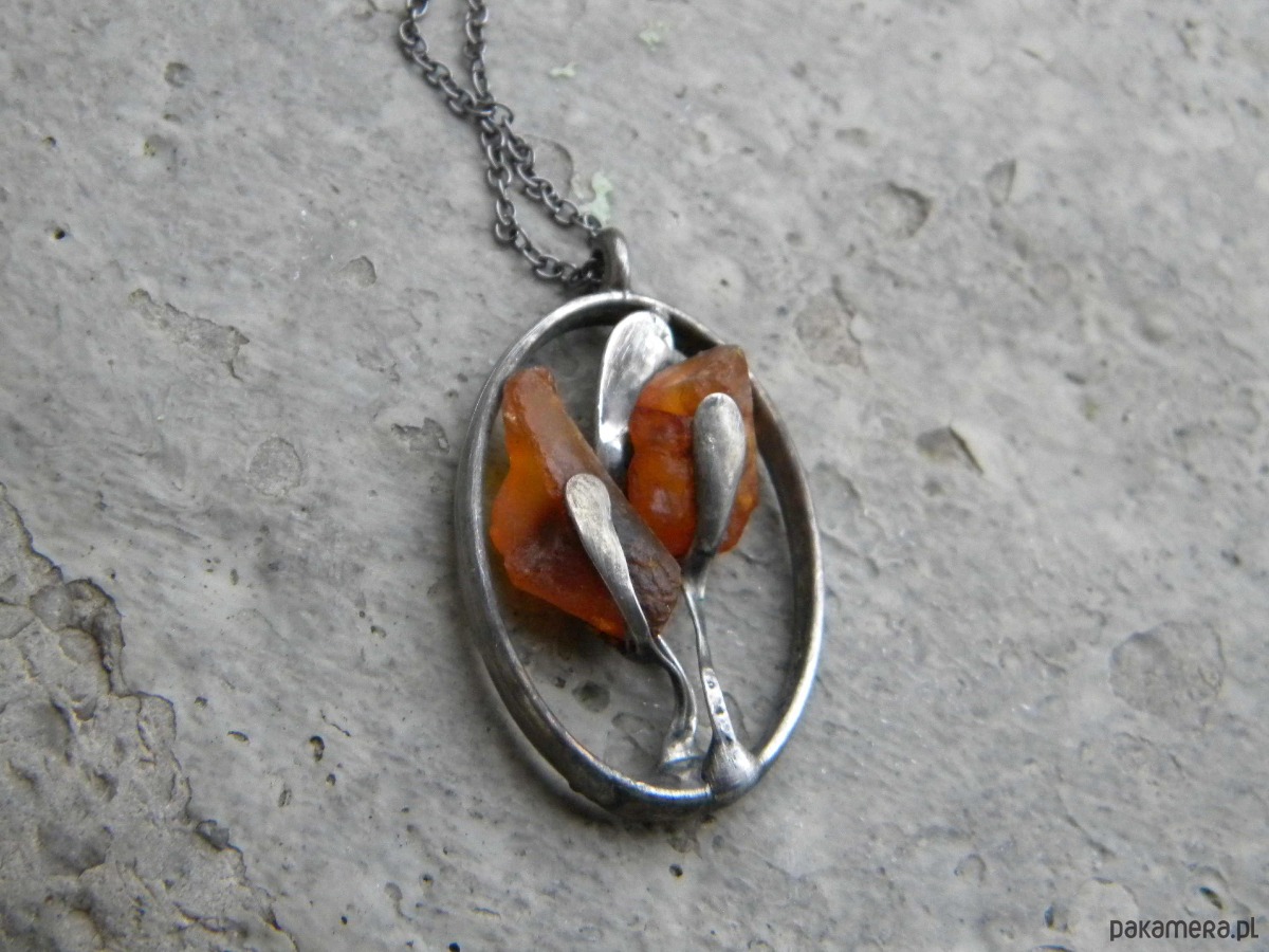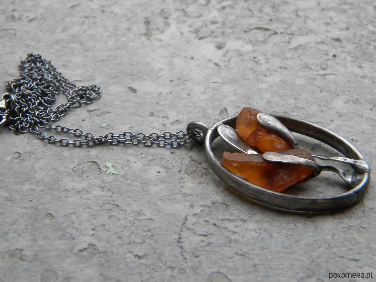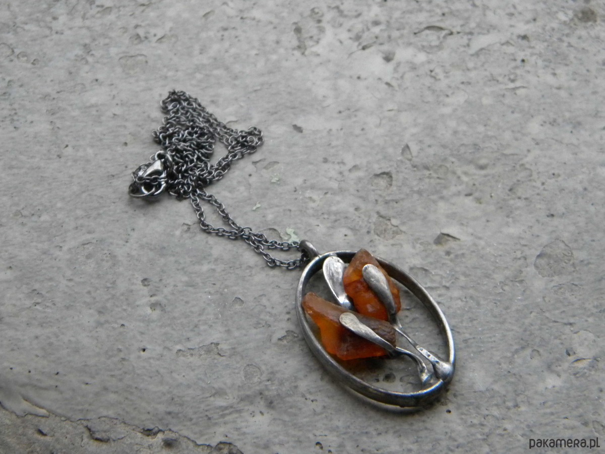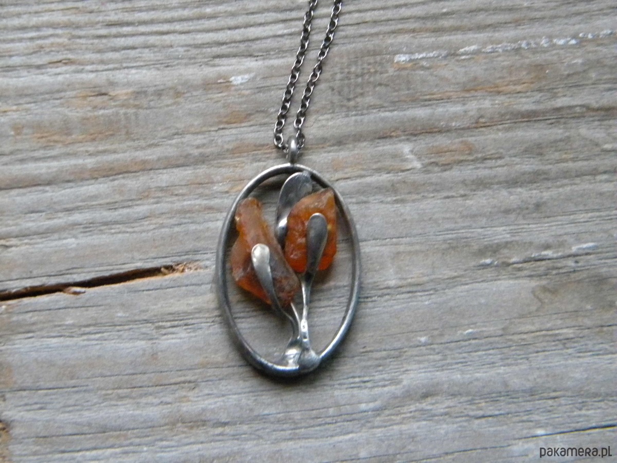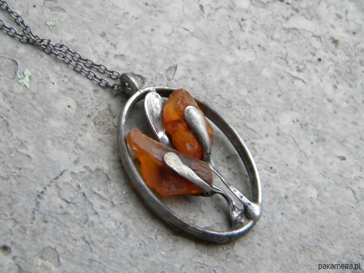 naszyjnik z bursztynów w ocynowanej miedzi.
