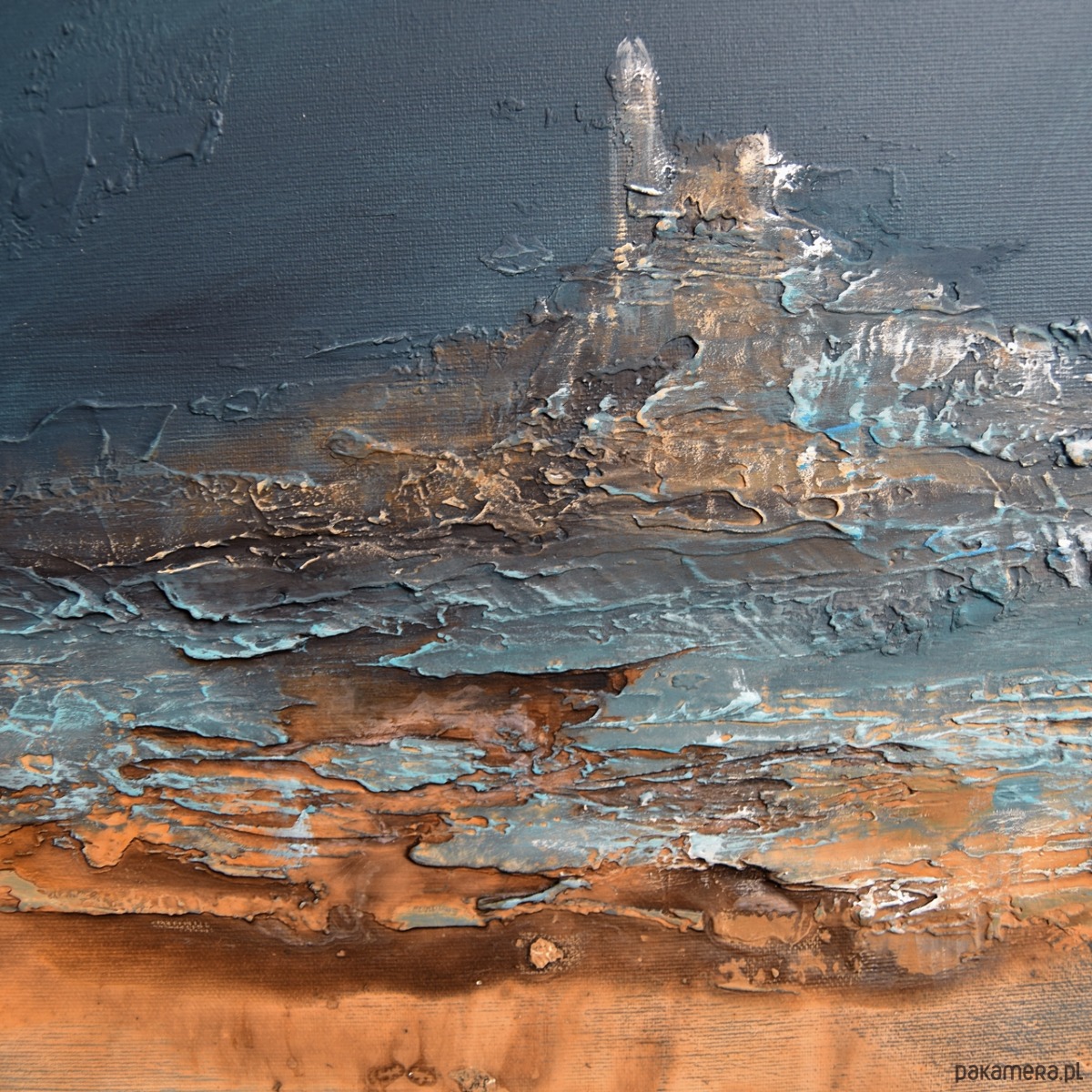 Obraz malowany w technice akrylowej, z wyraźną, grubą strukturą, na płótnie naciągniętym na blejtram (drewnianą ramę) o grubości ok. 2 cm. Rozmiar - 120/60 cm. Boki zamalowane są w tonacji całości. Obraz jest sygnowany, pokryty jest werniksem dla ochrony przed wilgocią.
