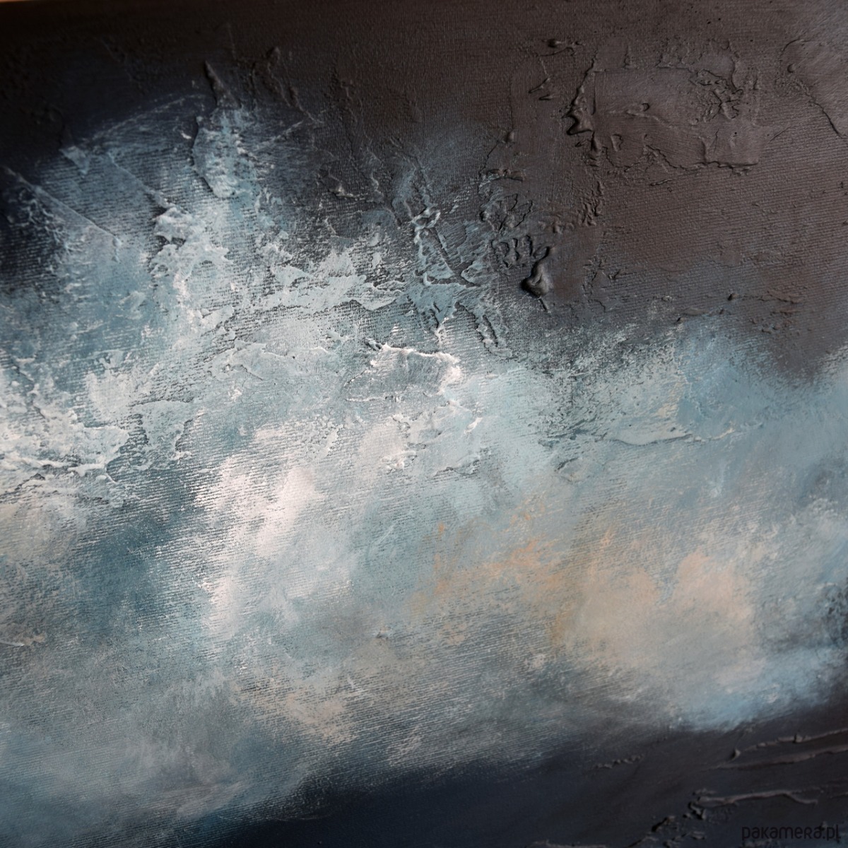 Kolorystyka: granat, czerń, niebieski, brąz, biel. Sprzedawany jest bez ramy, na kilku zdjęciach wizualizacja obrazu z przykładową oprawą.