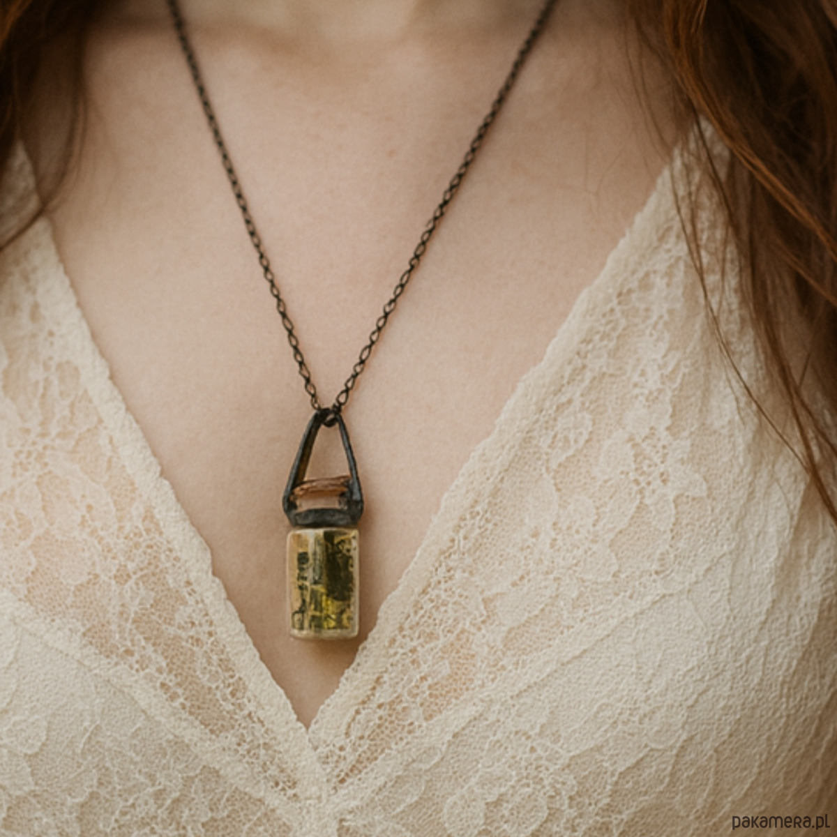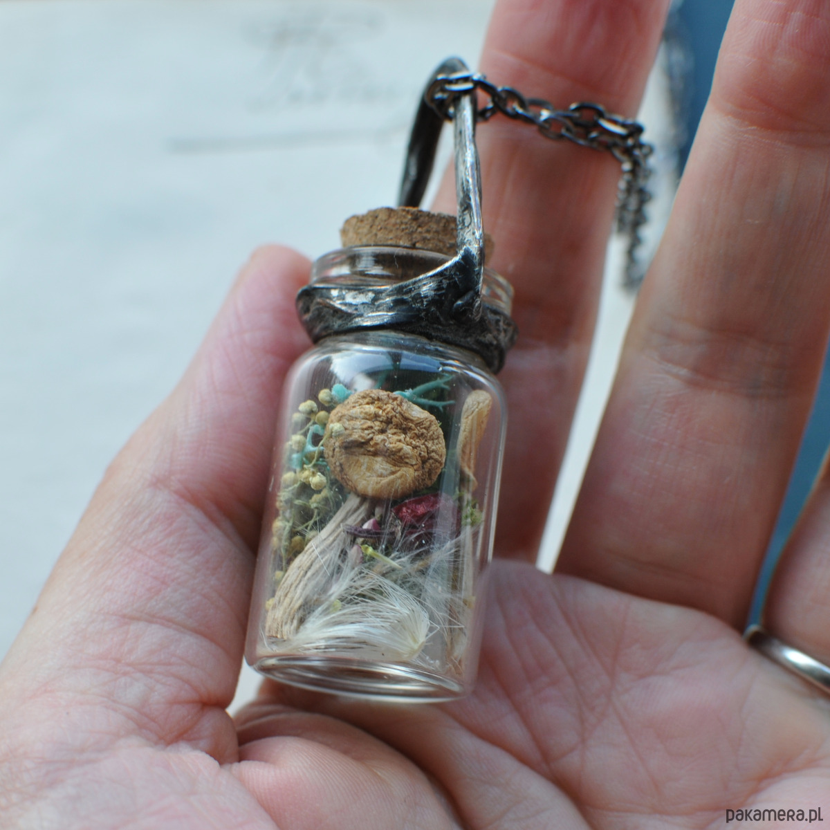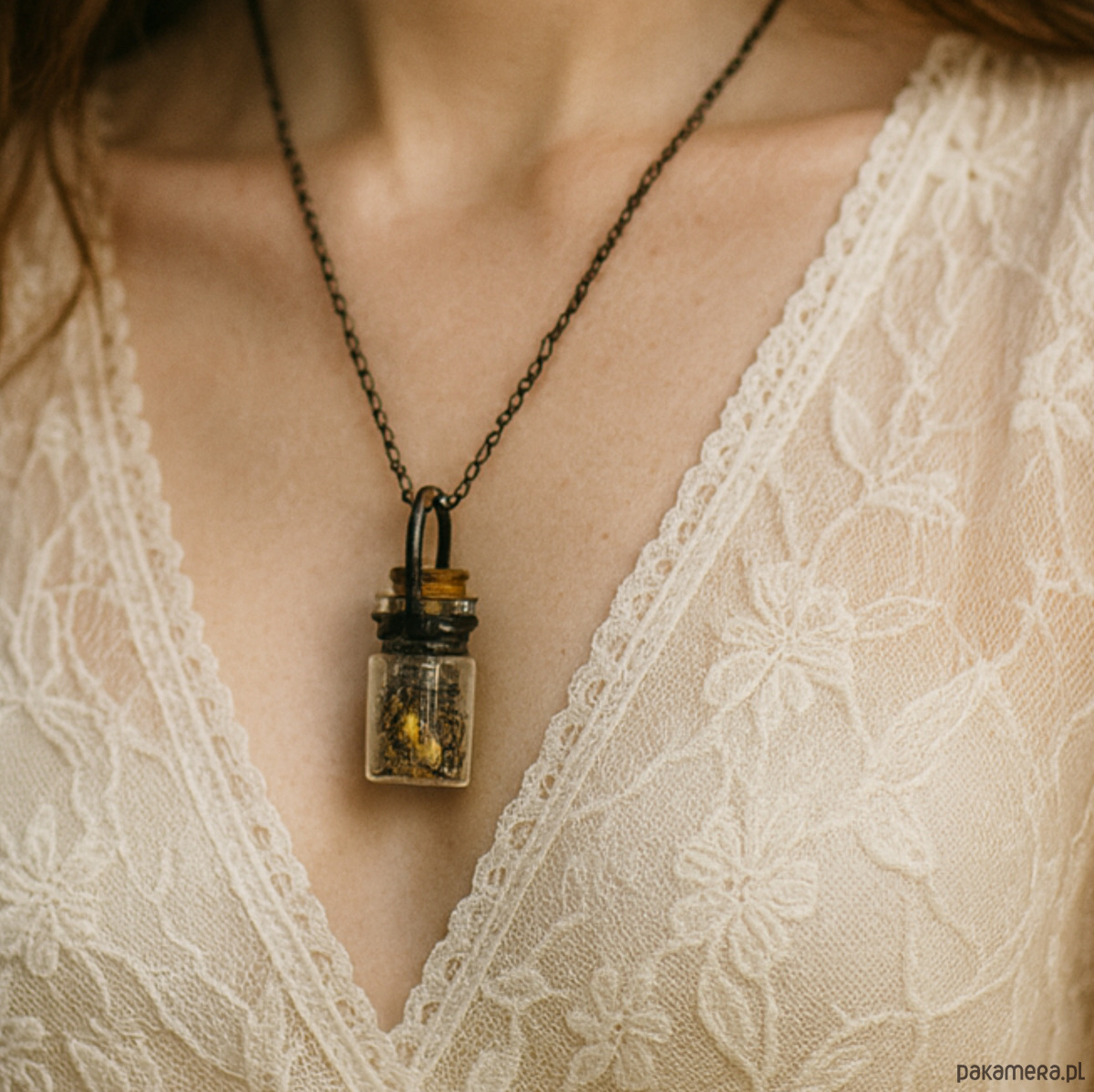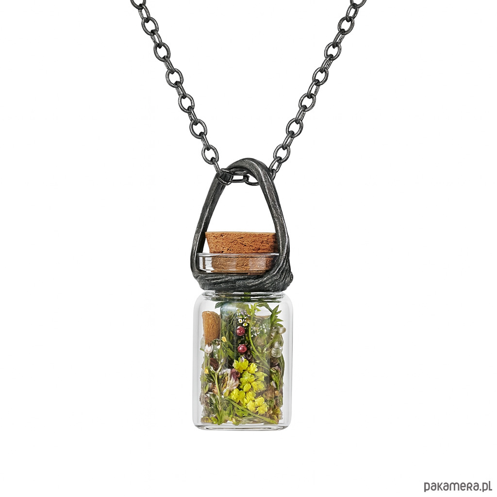 Maleńka szklana buteleczka o długości 4 cm i szerokości 2,5 cm zamienia się w wyjątkową ozdobę, którą możesz nosić zawsze przy sobie. Naszyjnik może pozostać pusty – gotowy na Twoje wspomnienia – albo zostać wypełniony naturalnym zestawem roślinnym, który sam wybierzesz.