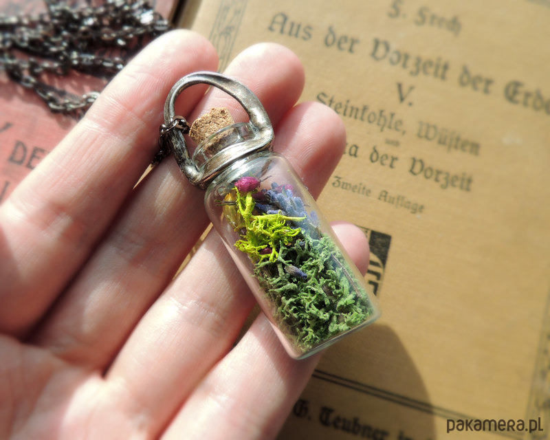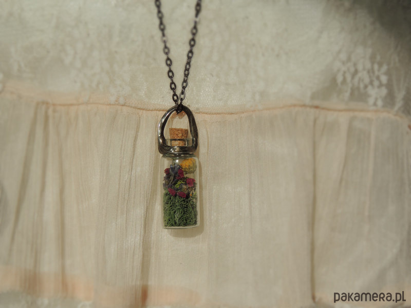 Naszyjnik buteleczka z różnorodną i kolorową zawartością.