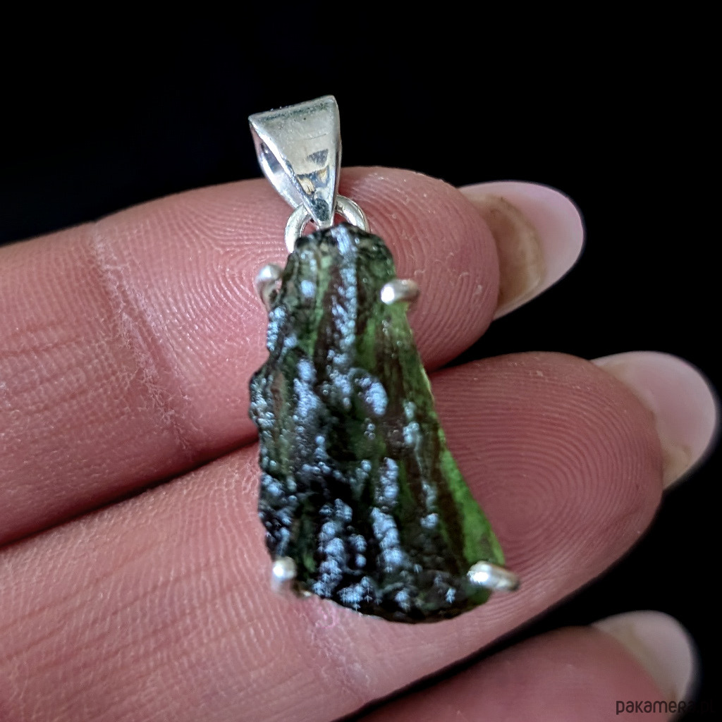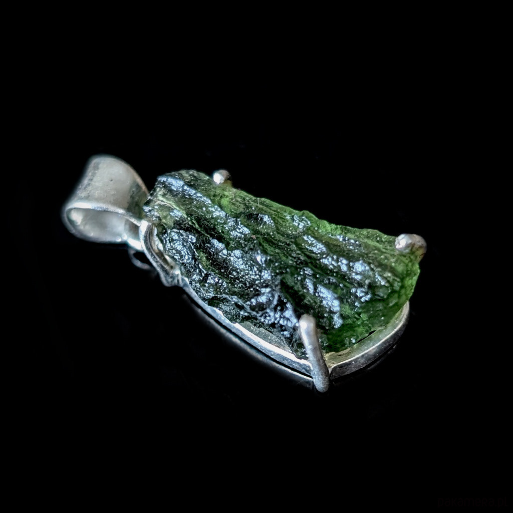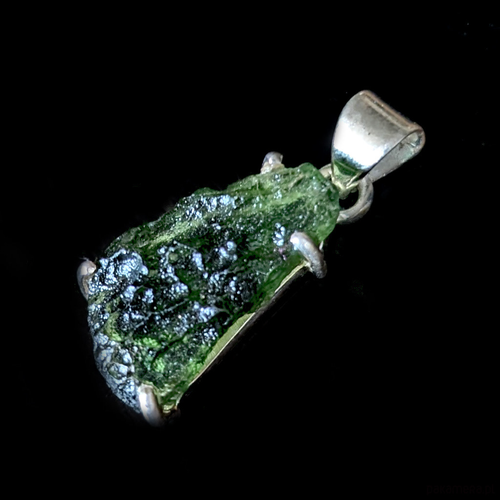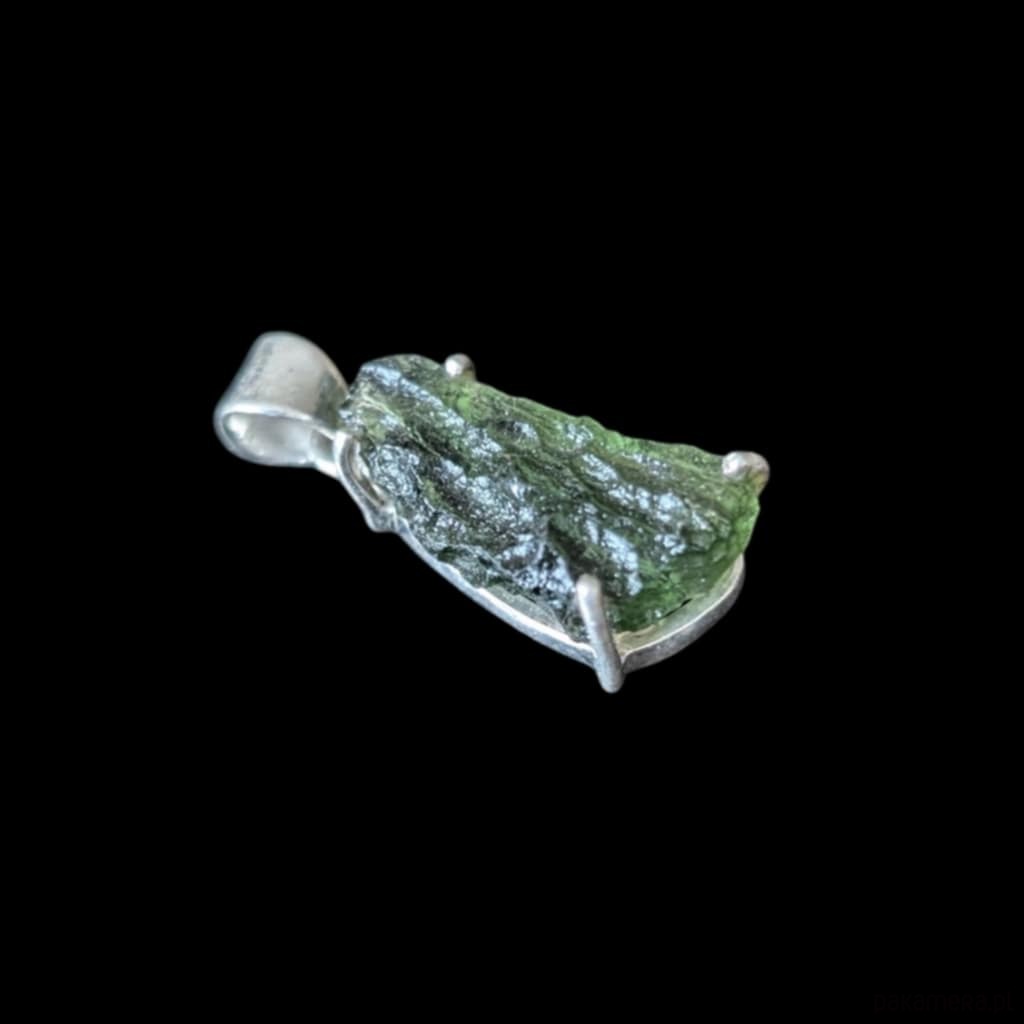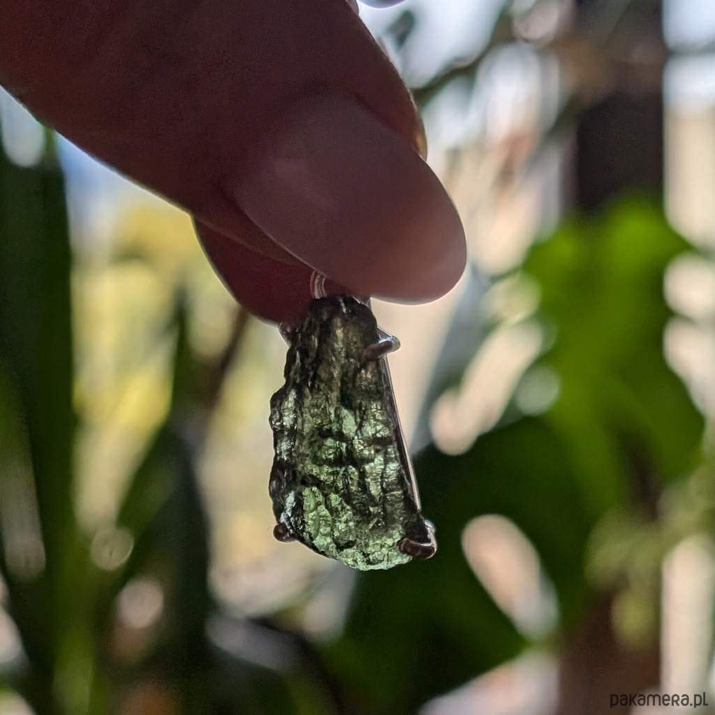 Wisiorek z oprawionym w srebro pr.925 jakościowym mołdawitem. Niezwykły okaz, o przepięknej barwie i wspaniale wykształconej strukturze. Mołdawit lub inaczej wełtawit to rodzaj tektytu, który pochodzi z krateru meteorytowego. Coraz rzadziej dostępne okazy. Wymiary oprawy 22 x 12 mm, z krawatką długość 30 mm. Waga 4 g. Dołączam metrykę. Wykonany przez dostawcę kamieni. Wisior zostanie wysłany w ozdobnym pudełeczku.
