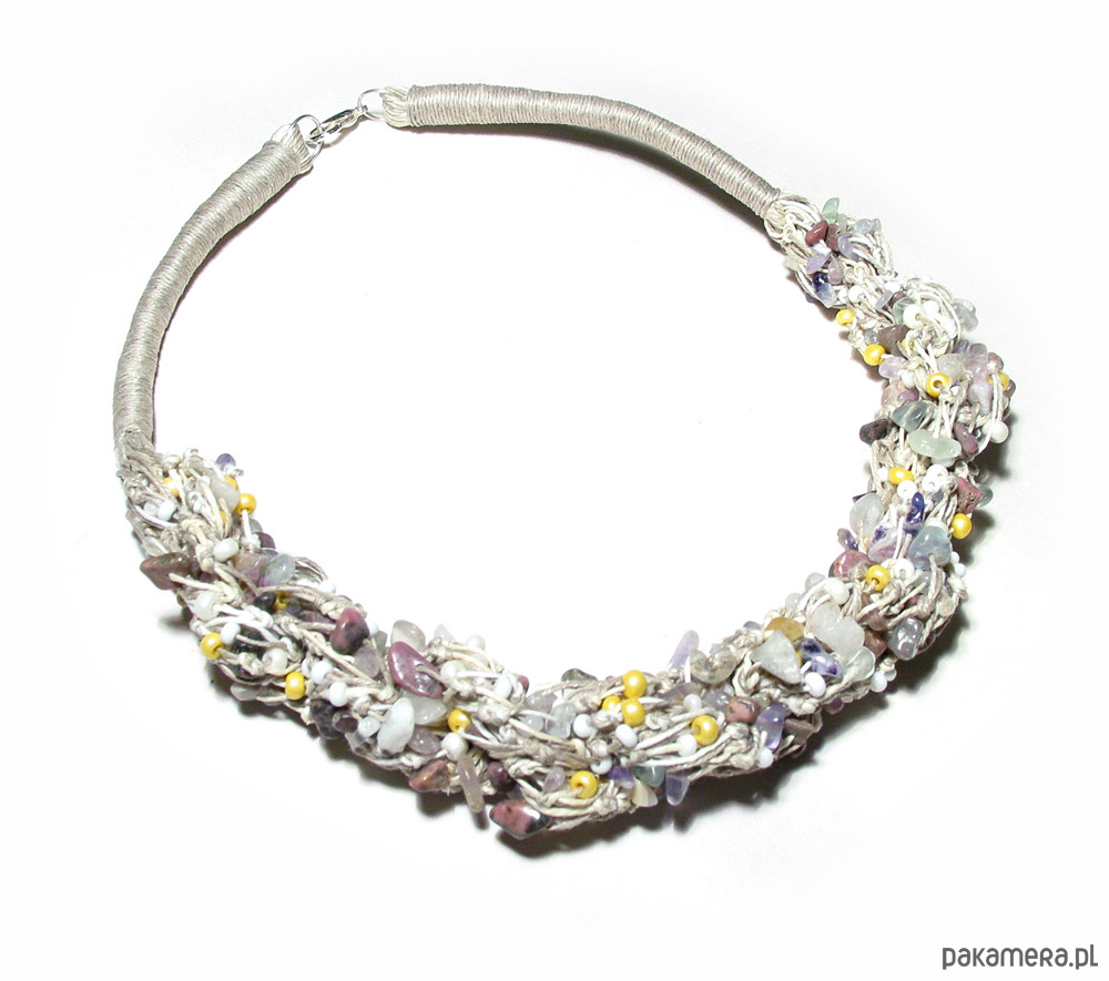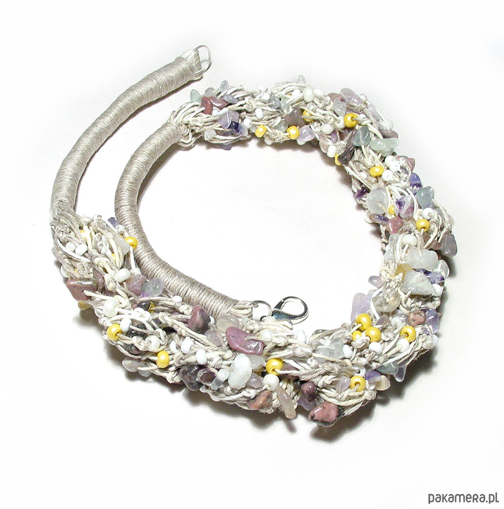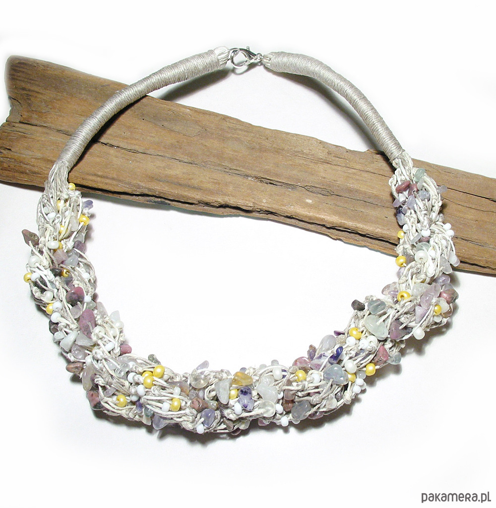 Wyjątkowy, organiczny naszyjnik wykonany na bazie polskiej przędzy lnianej w kolorze naturalnym i bielonym. W splocie znalazły się tonowane, pastelowe elementy szklane, nieregularne brułki ametystu, rodonitu, fluorytu i agatów.