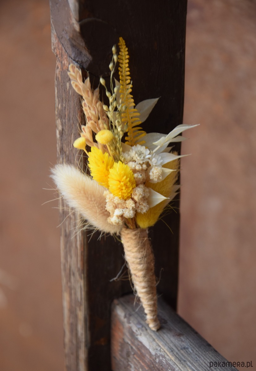 Rustykalna butonierka to idealny element stroju Pana młodego lub drużby. Świetnie sprawdzi się też jako dodatek ślubny dla pozostałych gości weselnych.