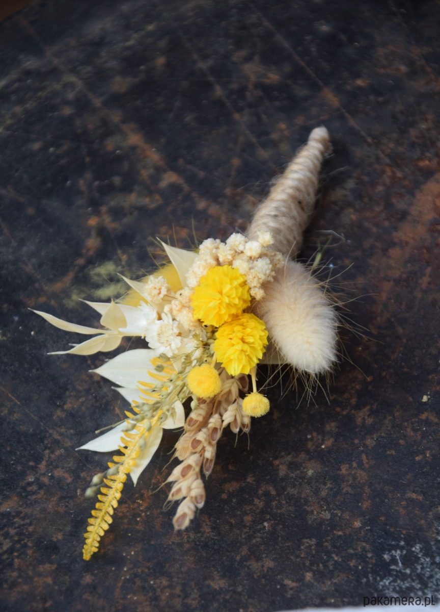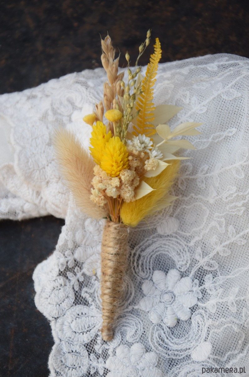 W tej wyjątkowej butonierce znajduje się stabilizowane i suszone rośliny. Całość wykończona jest naturalnym jutowym sznureczkiem. Butonierka wykonana jest z suszonych kwiatów zatem jest długotrwała. Aby była piękna przez bardzo długi czas wystarczy trzymać ja z dala od deszczu lub wilgoci.