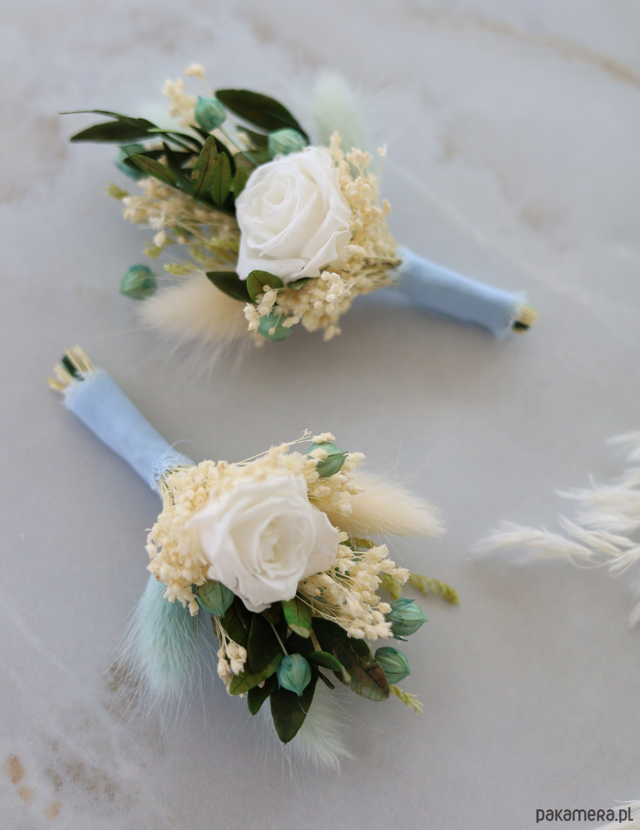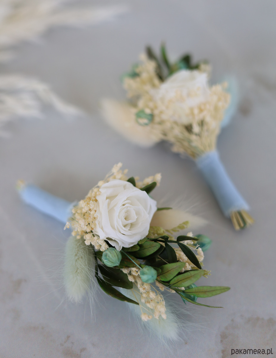 W butonierce znajduje się wieczna biała róża, oraz zielone stabilizowane rośliny, takie jak limonium i pistacja. Lekkości kompozycji nadają suszone dmuszki, phalaris, broom bloom i len.