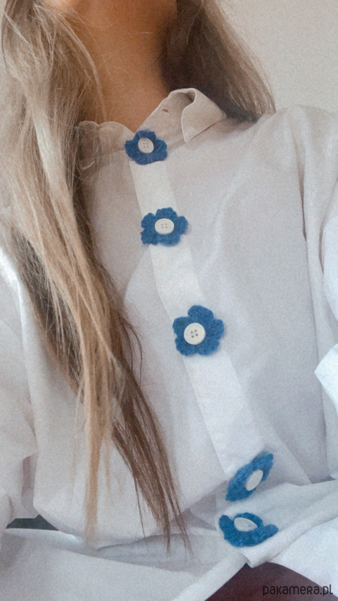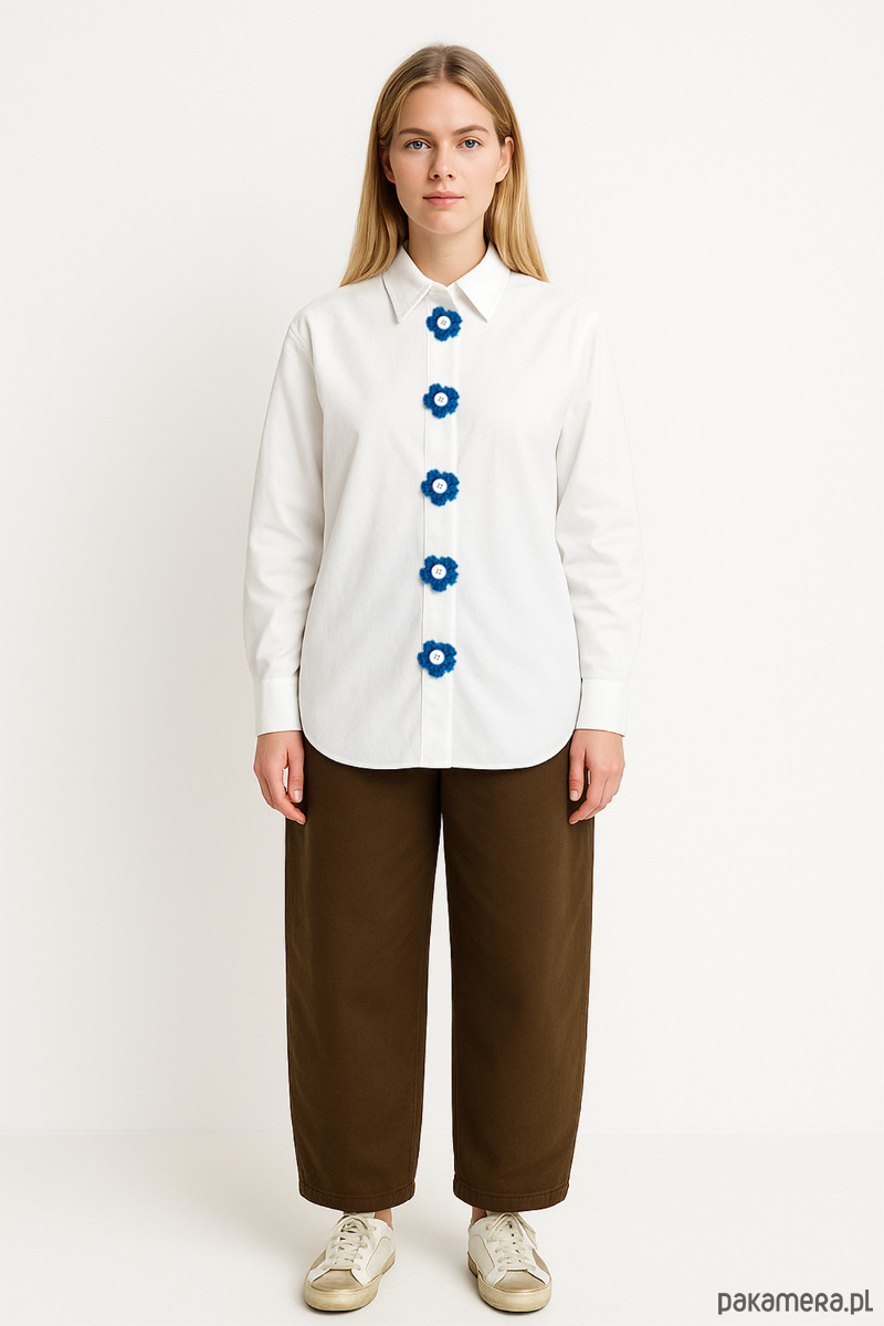 Kwiatek na guziku brzmi niewinnie, ale działa jak komentarz do całego stroju. Te małe szydełkowe nakładki nie „upiększają” koszuli w słodkim sensie, one zmieniają jej kontekst. Z modelu biurowego robią obiekt osobisty, a nawet trochę ironiczny. Koszula przestaje być uniformem, staje się świadectwem gustu i poczucia humoru.