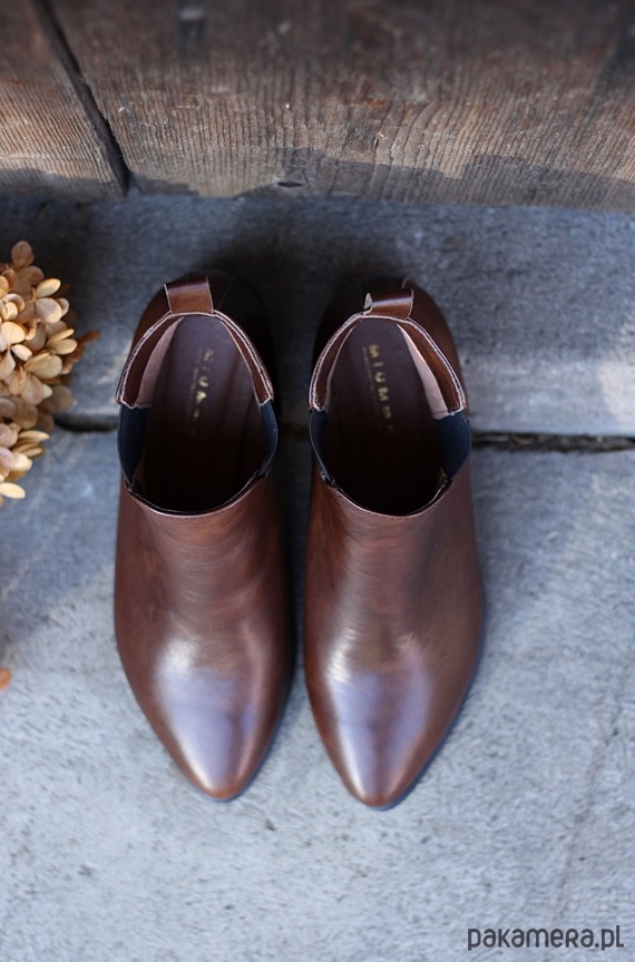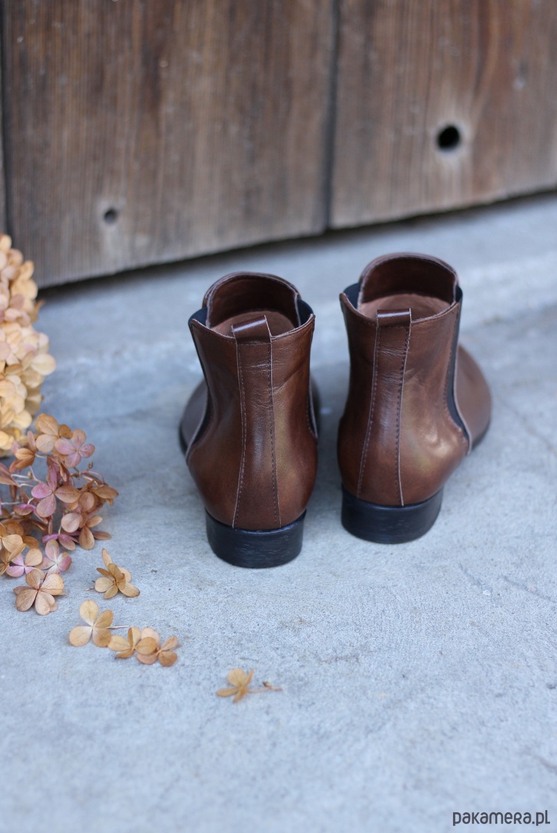 Klasyczne sztyblety z lekko wydłużonym noskiem wykonane ze skóry licowej w kolorze czekoladowym.