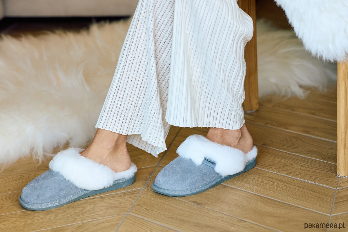 Kapcie wykonaliśmy w Polsce w stu procentach z naturalnych składników. Na wierzchu pokryte są mięciutką skórą owczą. W środku wyścieliliśmy je puszystą owczą wełną. To specjalny, puszysty rodzaj wełny, który nie podrażnia skóry i nie uczula. Naturalne materiały nie tylko cały czas grzeją stopy, ale też regulują temperaturę wewnątrz obuwia, zapobiegając przegrzaniu.