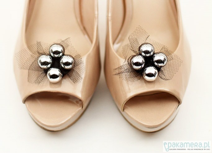 klipsy do butów srebrne kulki z czarnym tiulem