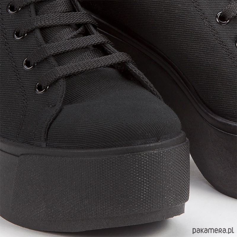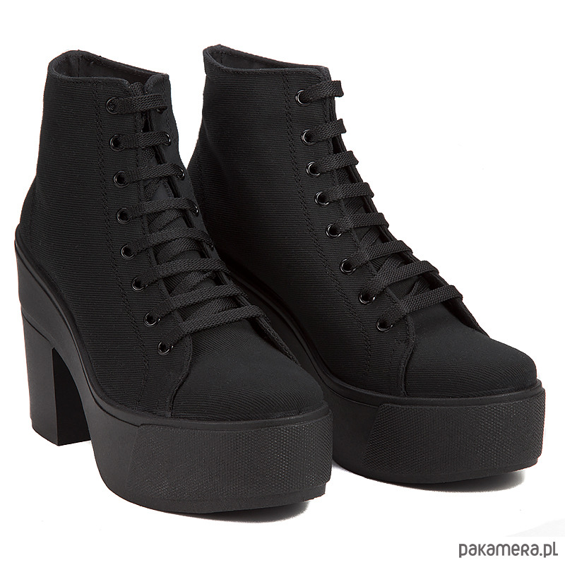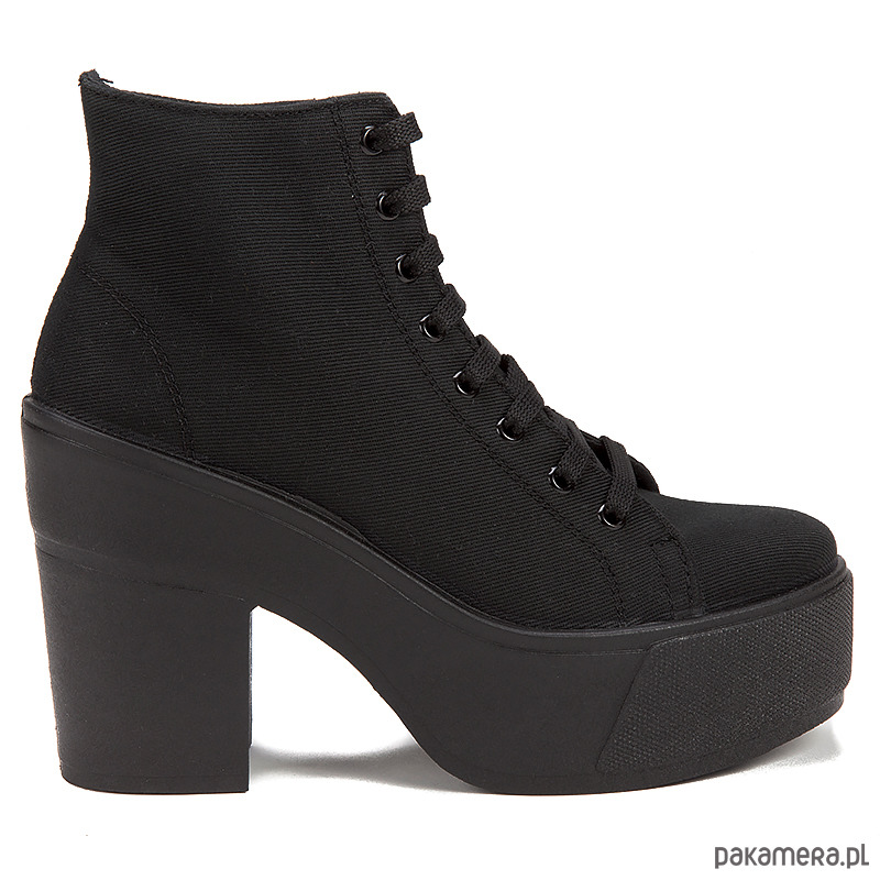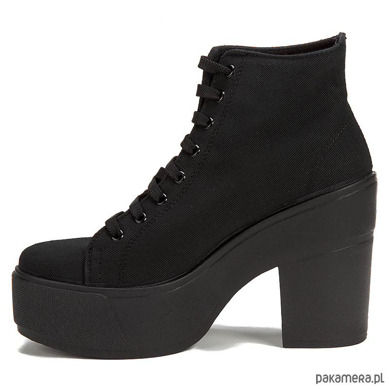 Botki są proste, surowe i ponadczasowe. Wykonane z wysokiej jakości materiału syntetycznego - Canvas. Korzenie marki tkwią w rockowym buncie i kulturze punk. Jest to produkt dla ludzi, którzy chcą wyrazić swoją niezależność i indywidualność. Wysokość obcasa - 10 cm (platforma 4 cm). Botki w kolorze Black.