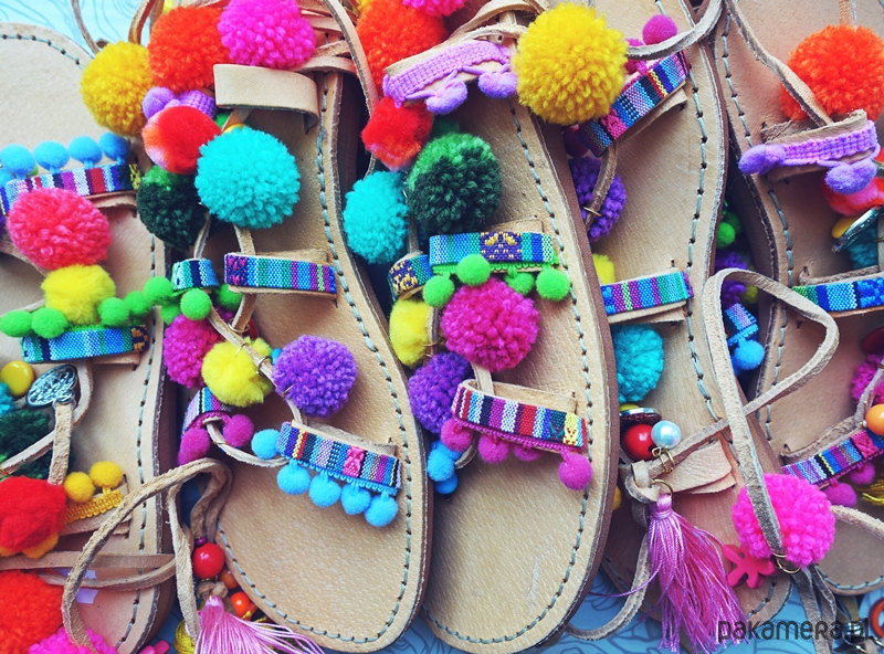 Skórzane sandały są zdobione ręcznie. Ręcznie wykonany jest każdy pompon i chwost. Wszystkie są ruchome i można je dowolnie przesuwać na rzemyku. Każdy koralik i zawieszka również są zamontowane tak, by można było je przesunąć :) Sandały są również zdobione po bokach bawełnianymi taśmami w etnicznych wzorach.