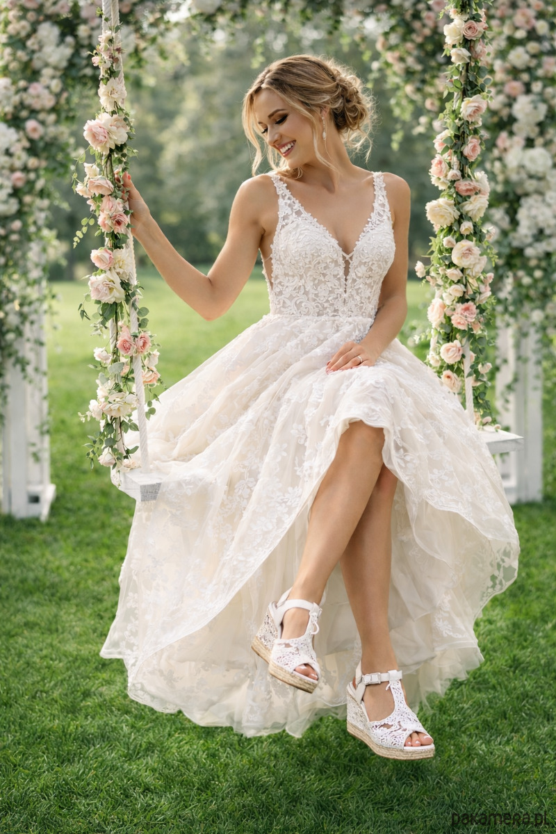 Te koronkowe espadryle na koturnie są idealnym dodatkiem do romantycznego ślubnego w stylu boho. Eleganckie, a zarazem niezwykle wygodne, damskie espadryle na koturnie zostały stworzone z miłością.