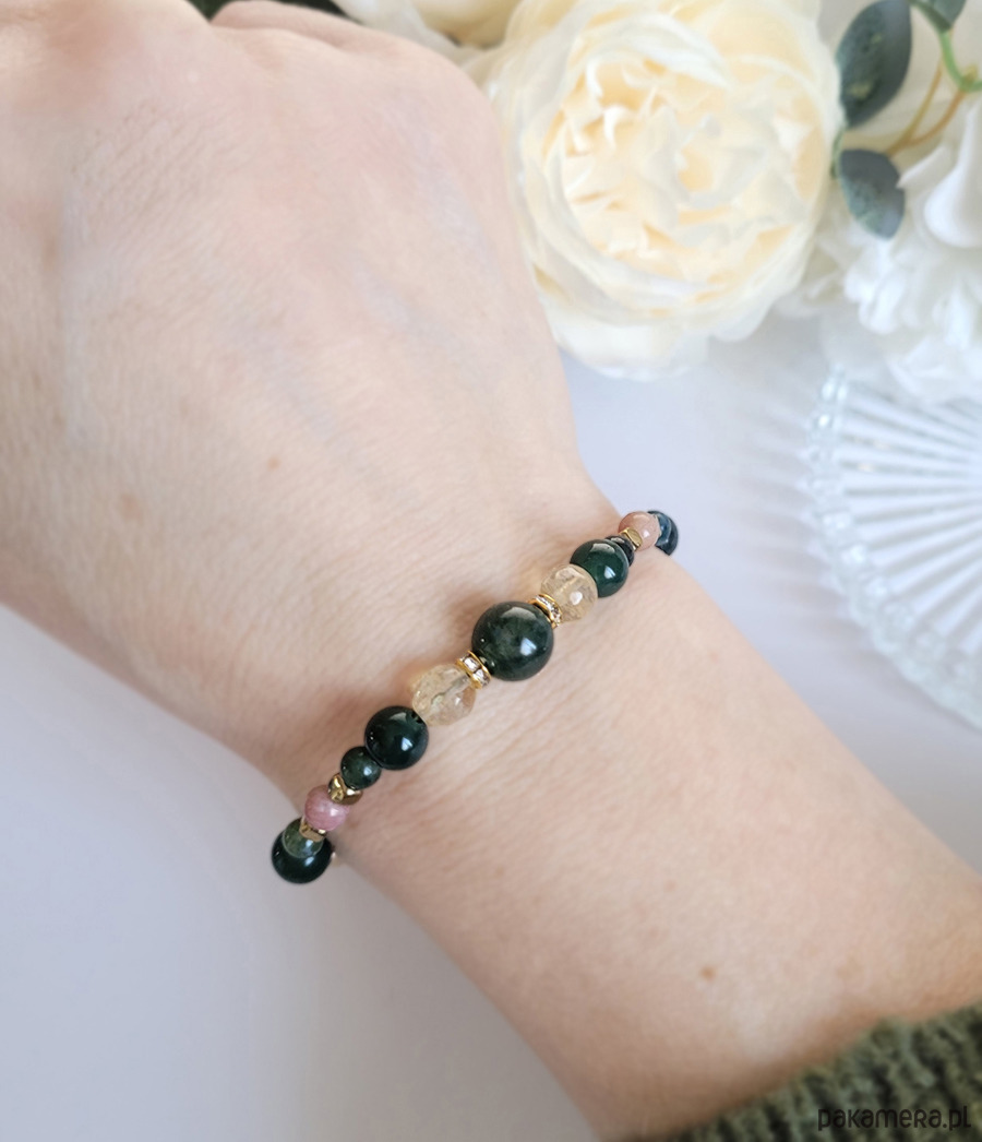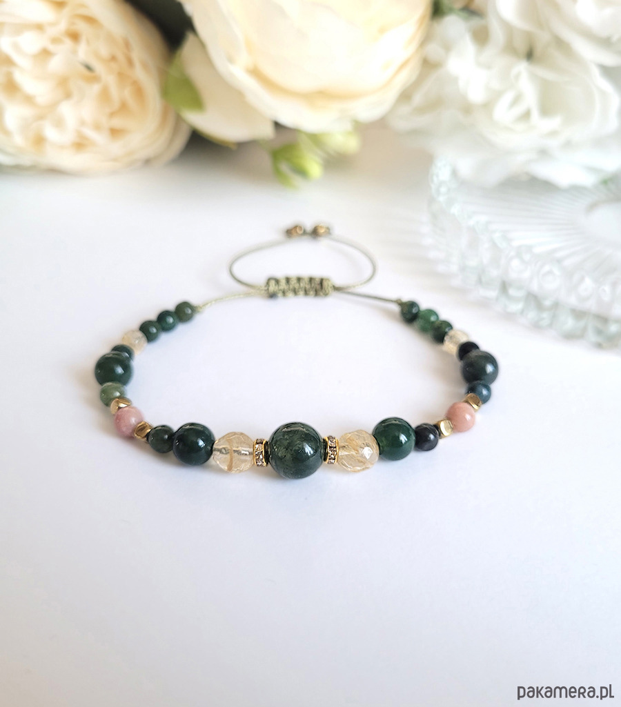 Damska bransoletka z kamieni naturalnych: Agatu mszystego, Cytrynu, Rodonitu oraz Hematytu głównie przeznaczona dla zodiakalnych Byków.
