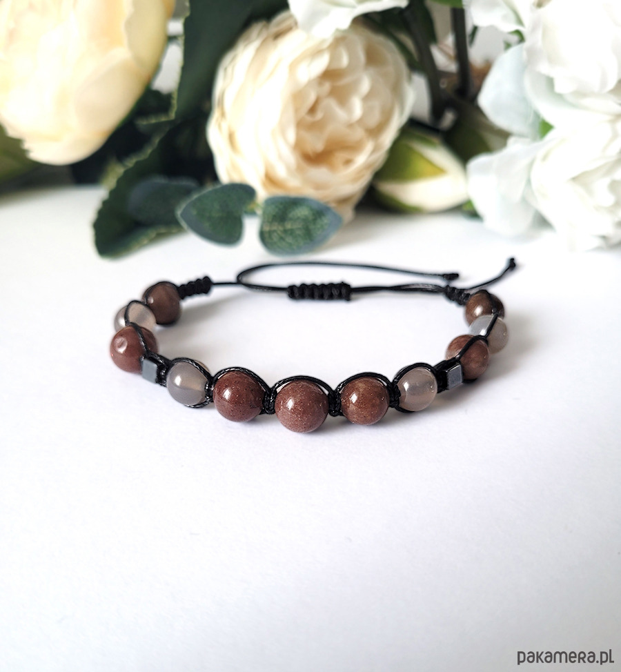 Męska bransoletka z kamieni naturalnych: Agatu mszystego, Agatu szarego, Awenturynu brązowego oraz Hematytu w kolorze srebrnym.