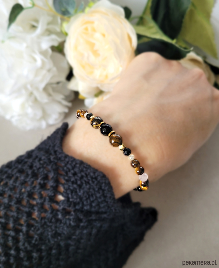 Bransoletka zrobiona z kamieni naturalnych: Tygrysiego oka, Turmalinu, Onyksu, Kwarcu różowego oraz Cyrkonii głównie przeznaczona dla zodiakalnego Byka.
