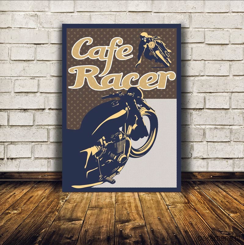 Plakat w stylu vintage z autorską grafiką inspirowaną motocyklami typu Cafe Racer.