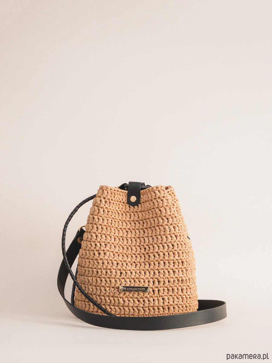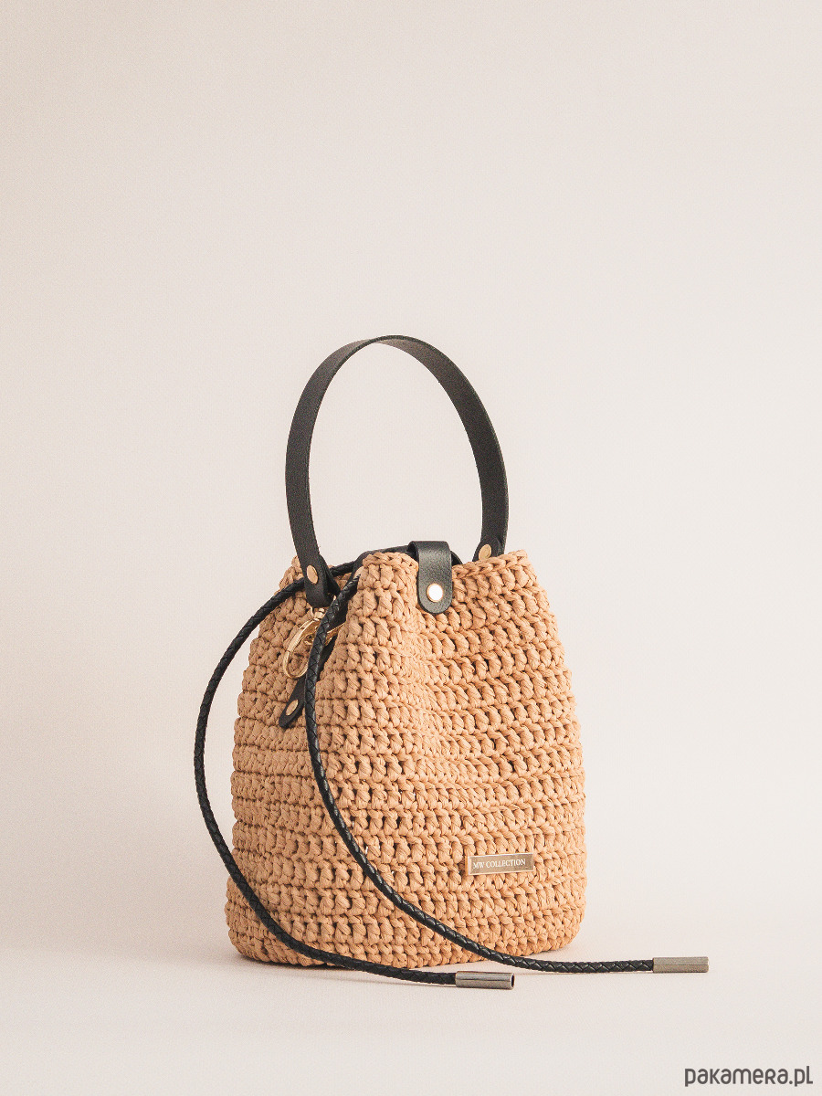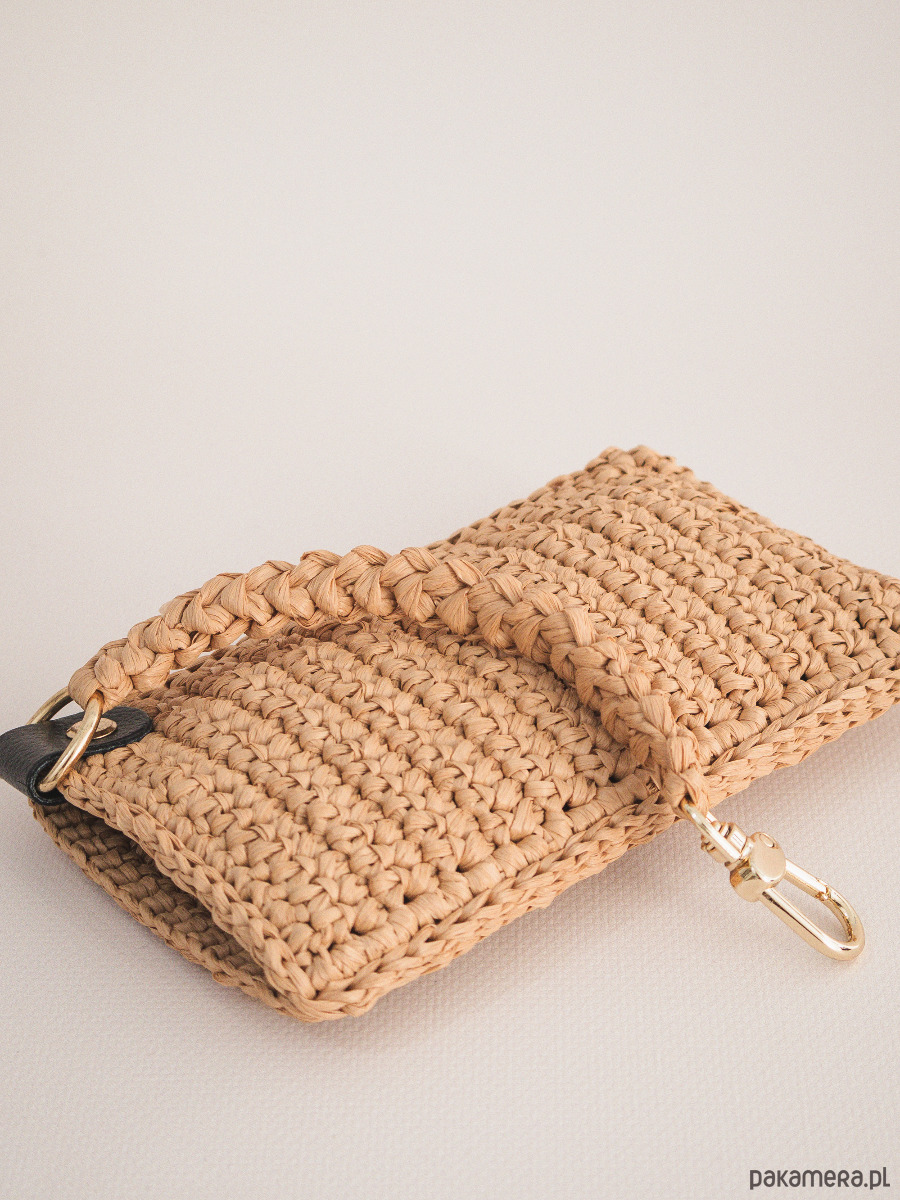 Torebka Calpe to mały poręczna torebka w stylu worka, wykonana na szydełku z rafii naturalnej. Otwarta górna cześć ściągana za pomocą skórzanego sznurka. Rączka i spód torebki wykonane z wysokiej jakości skóry naturalnej. W komplecie wygodne etui na telefon przypinane do torebki oraz pasek do noszenia przez ramię.