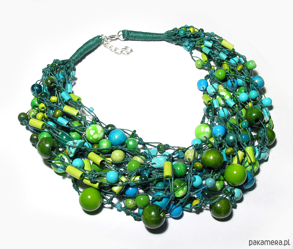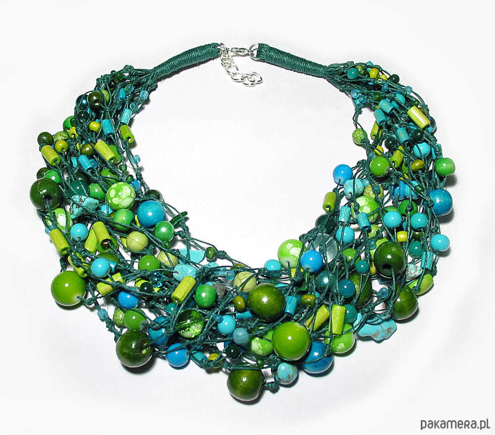 Naszyjnik idealny na wiosnę! Wykonany na bazie szmaragdowej przędzy lnianej, utrzymany w tonacj iturkusowych błękitów i soczystych zieleni. W splocie znalazły się bryłki howlitu, turkus, elementy szklane oraz drewniane.
