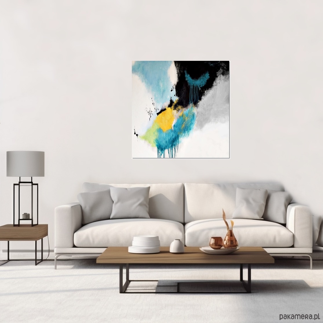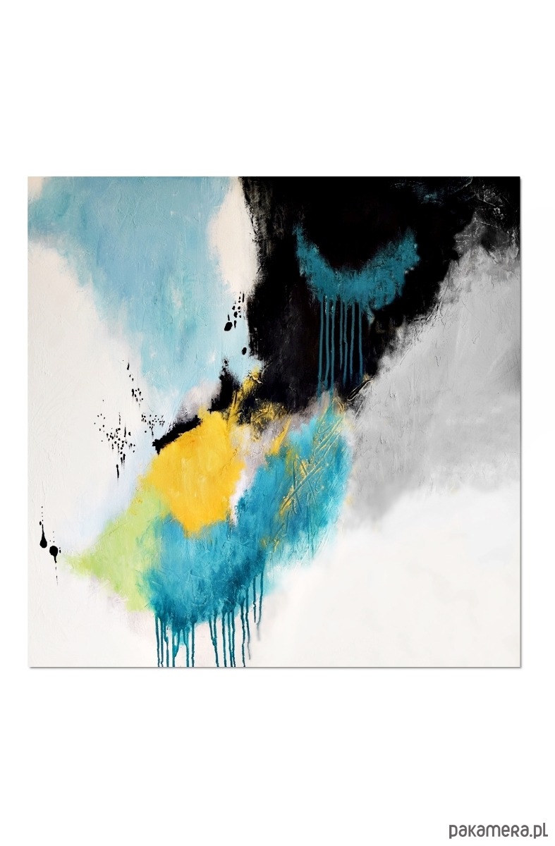 Obraz malowany w technice akrylowej na płótnie naciągniętym na blejtram (drewnianą ramę) o grubości ok. 2 cm. Rozmiar - 80/80 cm. Boki zamalowane są w tonacji całości. Obraz pokryty jest werniksem dla ochrony przed wilgocią.