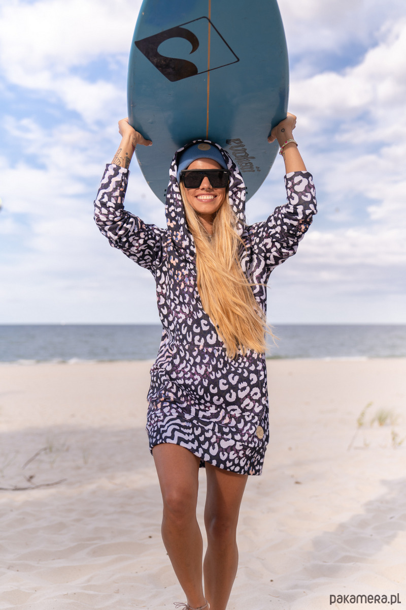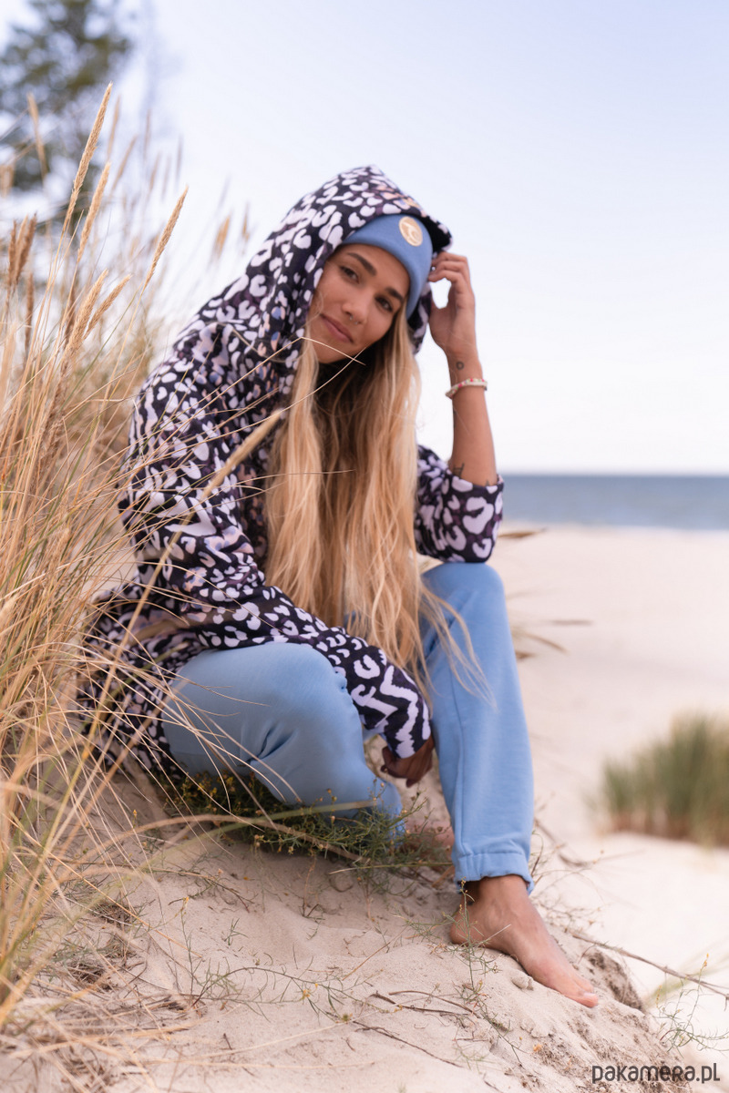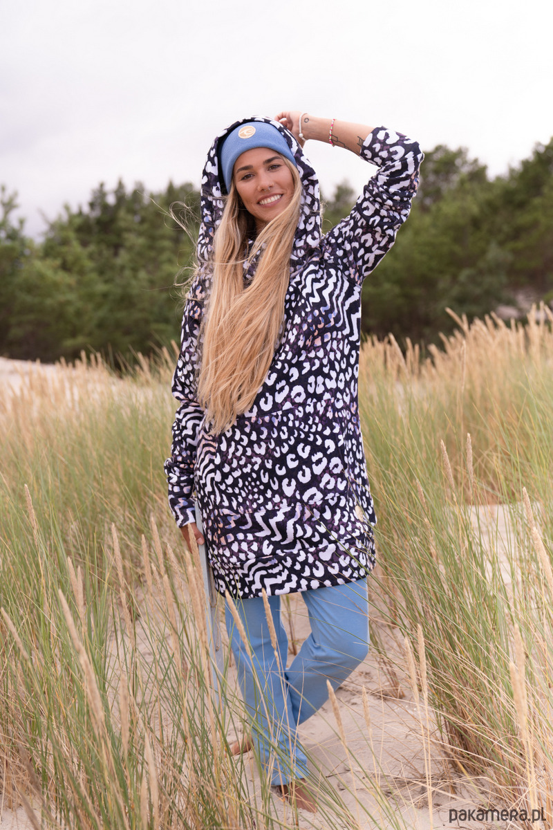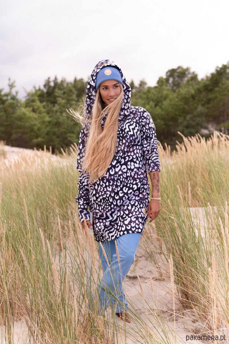 Bluza Candy long black/white zebra to bluza długa ktora wykonana jest z dzianiny bawełnianej w oryginalnym nadruku w zebrę z elementami panterki. Idealna dla wszystkich, który uwielbiają duże kaptury. Bardzo twarzowa bluza z naszytą kieszenią typu kangur. Okrągłe logo marki naszyte z przodu. Bluza posiada otwory na kciuki, dzięki czemu sprawdzi się na jesienno- zimowe spacery.