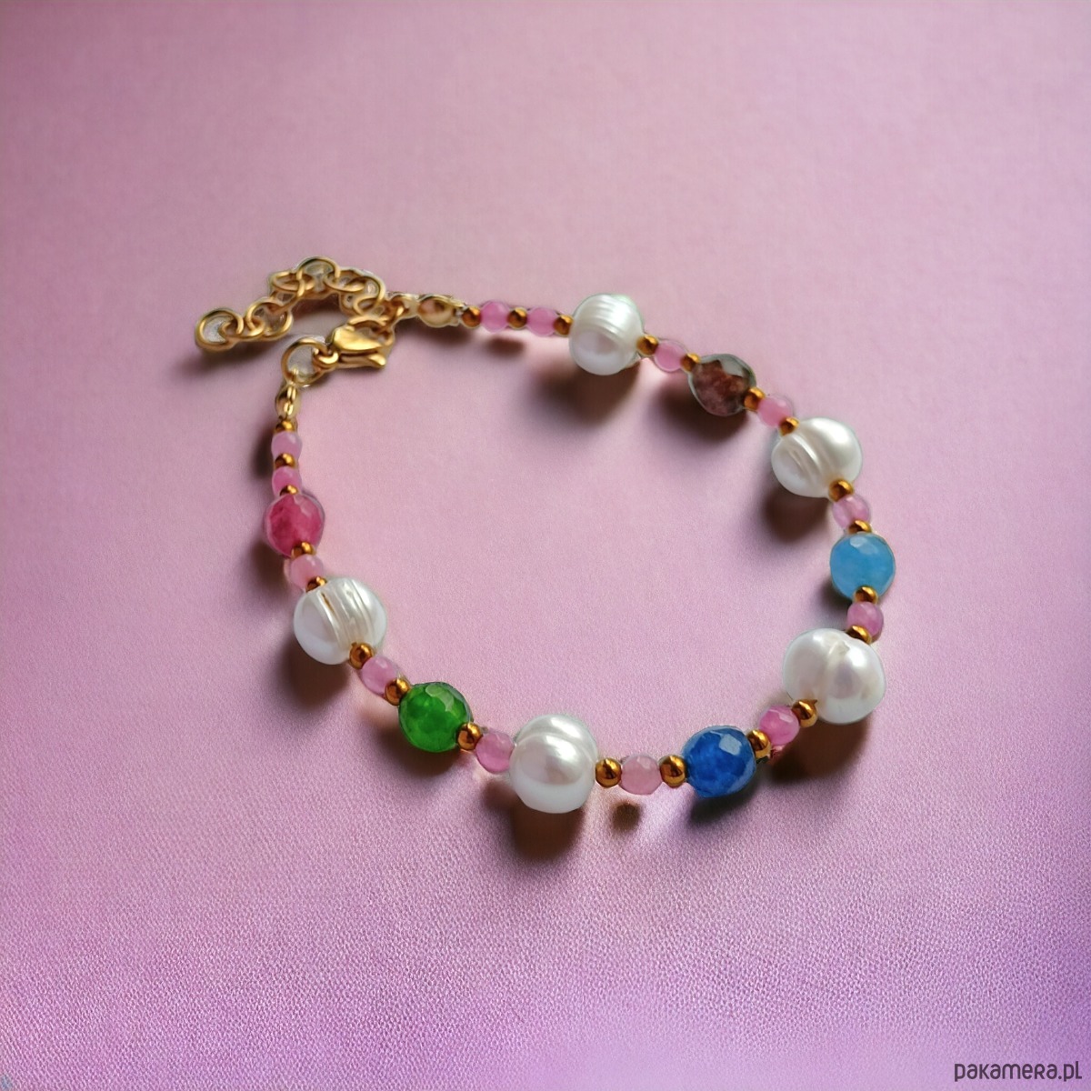 Bransoletka na solidnej lince stalowej (miękkiej) - został wykonany z wielobarwnego, fasetowanego jadeitu 6mm, fasetowanego różowego jadeitu 3mm, naturalnych pereł słodkowodnych i przekładek ze złotego hematytu.