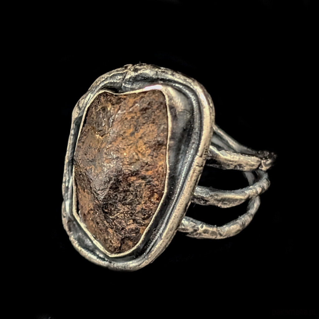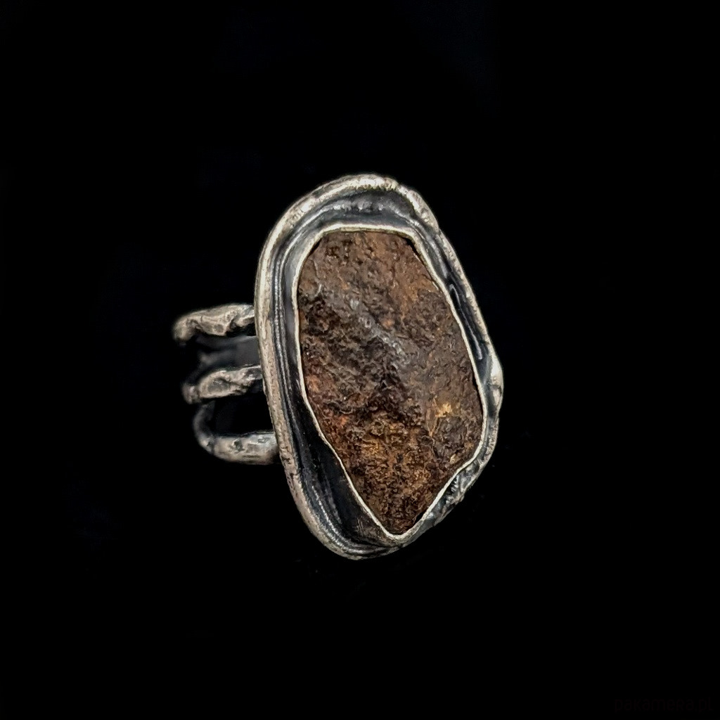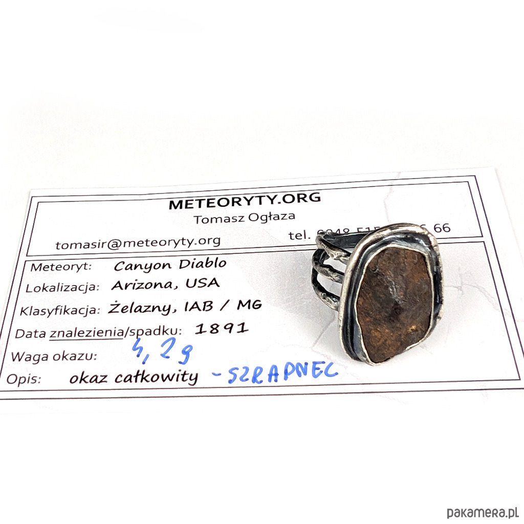 Rzadki, poszukiwany meteoryt. Meteorytowy krater uderzeniowy na obszarze Canyon Diablo hrabstwa Coconino stanu Arizona w Stanach Zjednoczonych,średnica 1200 metrów i głębokość 170 m. Ocenia się, że powstał około 50 tysięcy lat temu, w wyniku uderzenia meteorytu żelaznego o średnicy ok. 50 metrów .Okazy znajdowane są od 1891 r. w promieniu kilkunastu kilometrów wokół słynnego krateru. Największy waży 454 kg., a do dziś zebrano ponad 30 ton. Meteorytom przypisywane są magiczne właściwości talizmanów. Z pewnością jest to niebanalny materiał jubilerski w ciekawy sposób zakomponowany w srebro.Ze względu na unikatową rzeźbę każdego meteorytu, pierścionek jedyny i niepowtarzalny w swoim rodzaju. Fantastyczny prezent dla niego lub dla niej. _