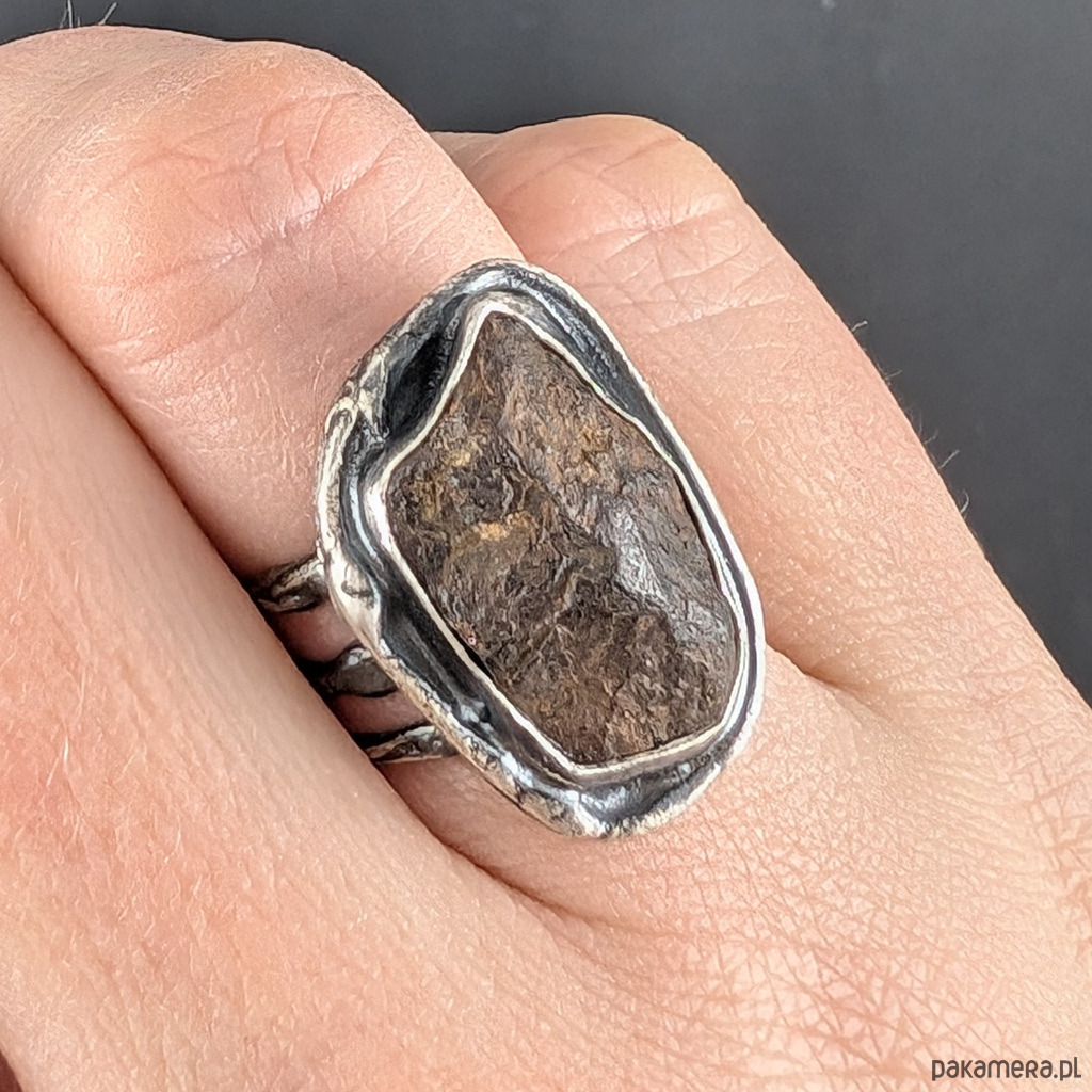 Okaz oprawiony w oksydowane srebro próby 925. Wymiary oprawy 23 x 17 mm, rozmiar jubilerski 13 do max 14. Waga 10,5 grama. W zestawie metryka do meteorytu. Pierścięń zapakowany w ozdobne pudeleczko