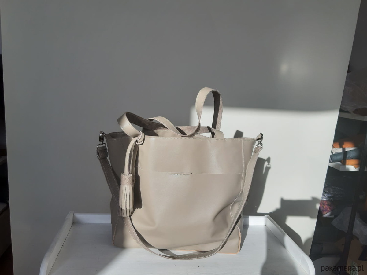 Duża miękka skórzana torba. Uszyta z miękkiej skóry naturalnej w szaro - kolorze beżowym: odcień cappucino, taupe.