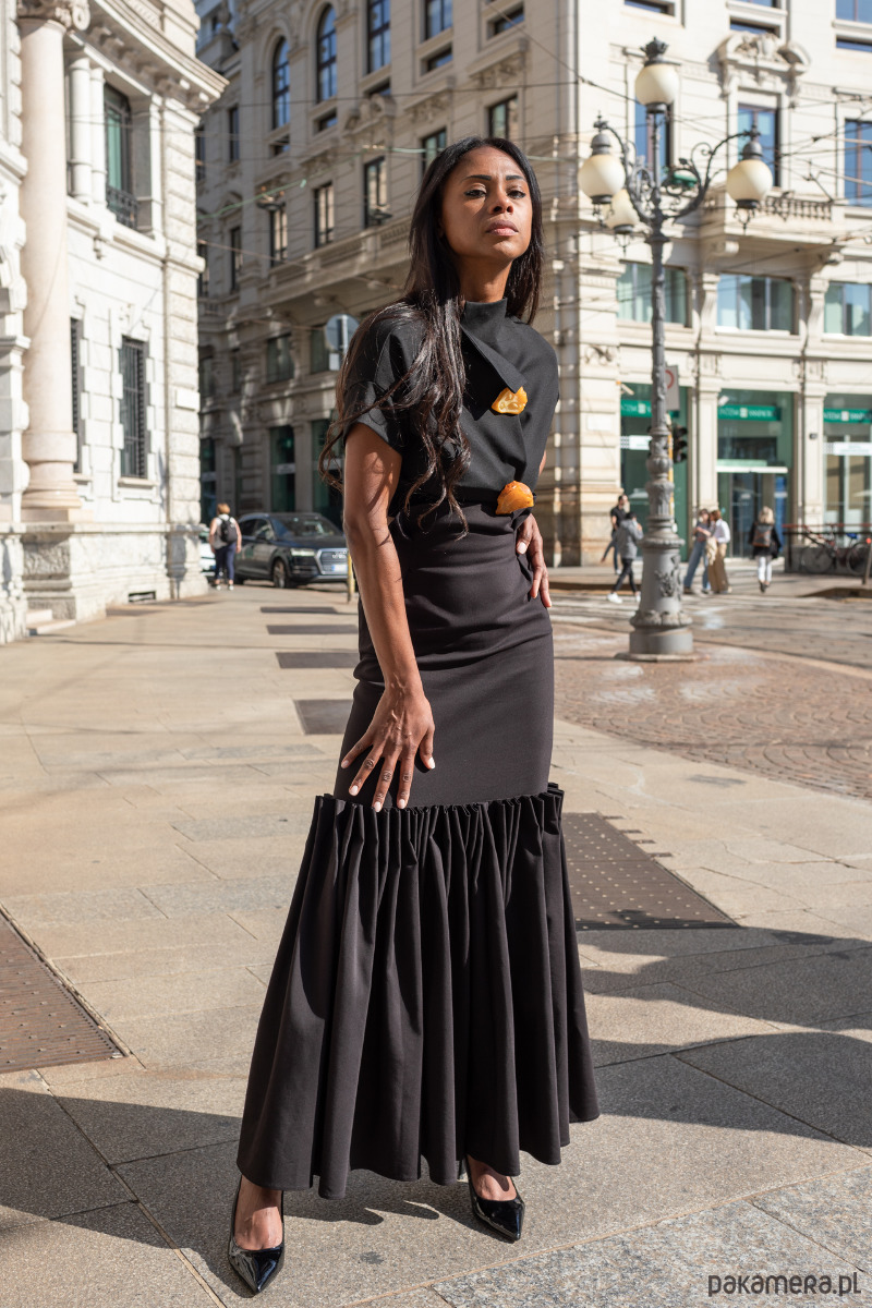 następnie asymetryczna bluzka z jednym, bufiastym rękawem i tiulowym, dłuższym rękawem,