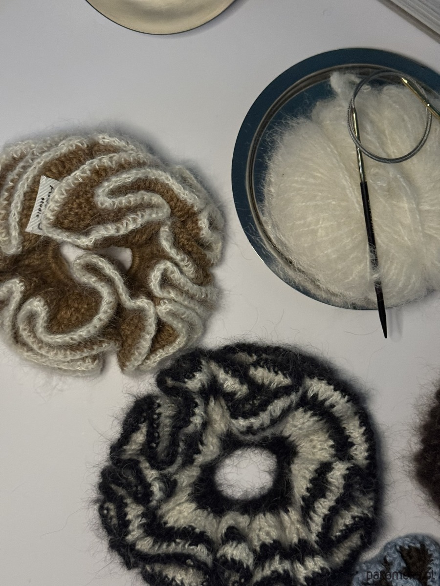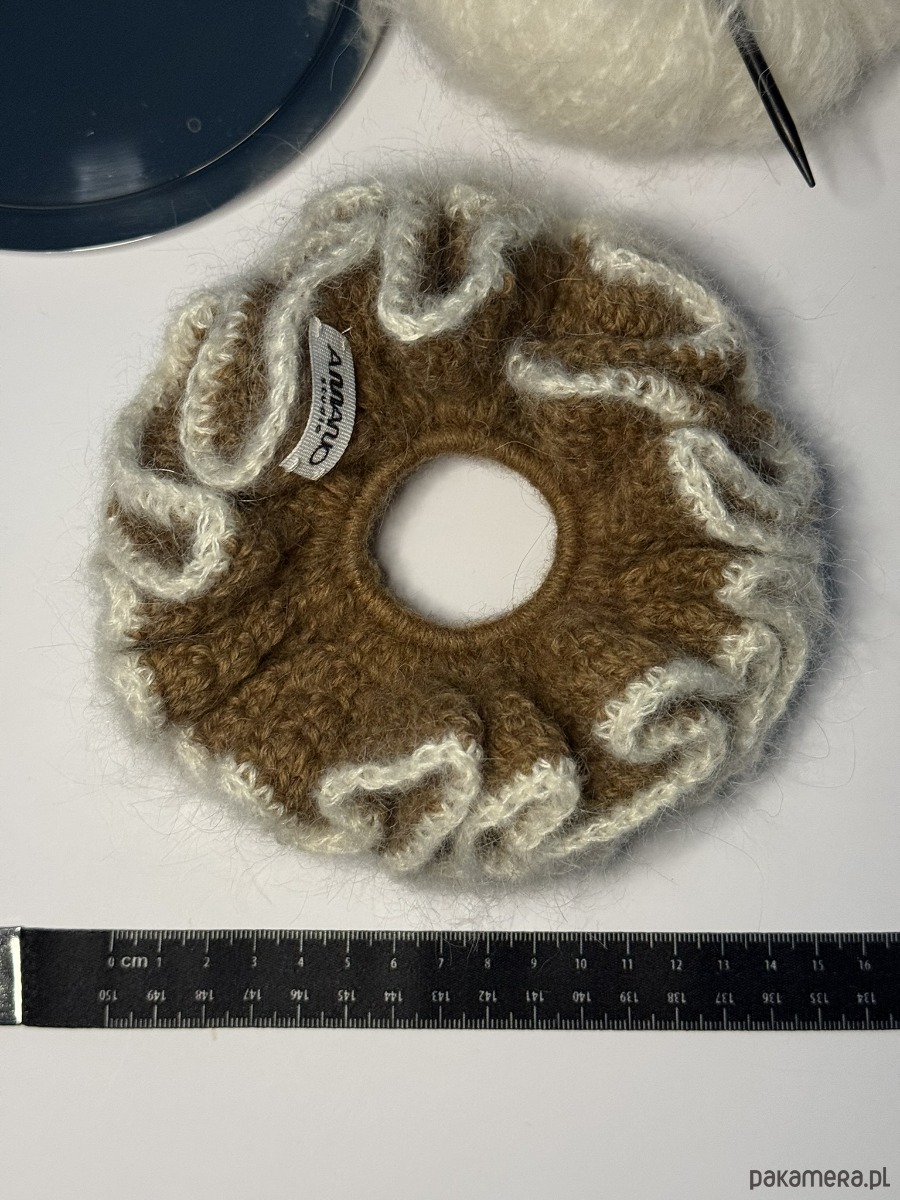 Gumka do włosów wykonana na szydełku z dwóch kolorów włóczki - karmelowej oraz białej. Skład włóczki karmelowej to 55% baby alpaka, 45% wełna merynosa, zaś biała to 75% moher, 25% jedwab.