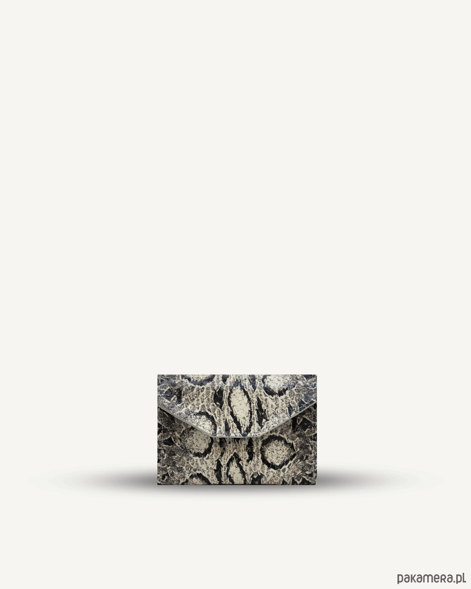 Cardholder z biało czarnej skóry tłoczonej na wzór węża, w połysku z wyczuwalną łuską. Trzy przegródki na karty, gdzie łącznie zmieści się nawet 10 kart. Jedna kieszeń na froncie i dwie kieszenie w przegrodzie zapinanej na nap, co uchroni je przed wysunięciem lub kradzieżą. Napa obciągnięta skórą w tym samym kolorze.