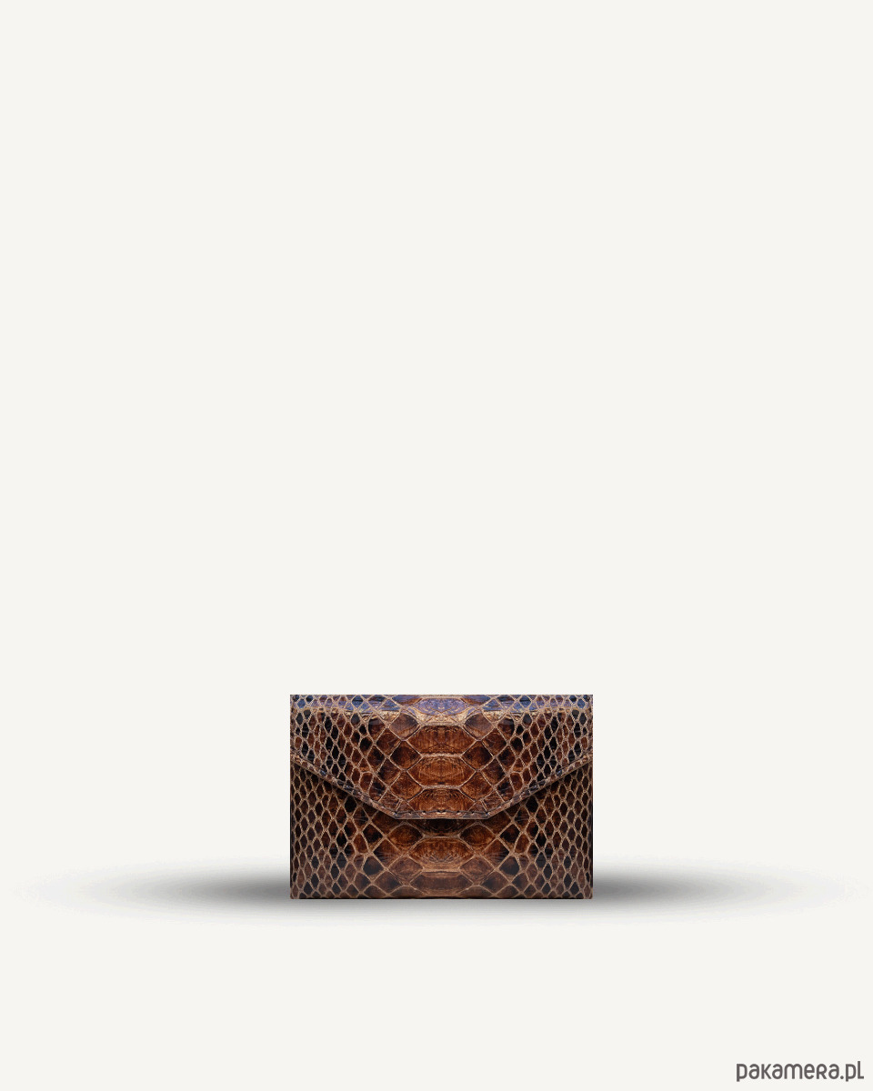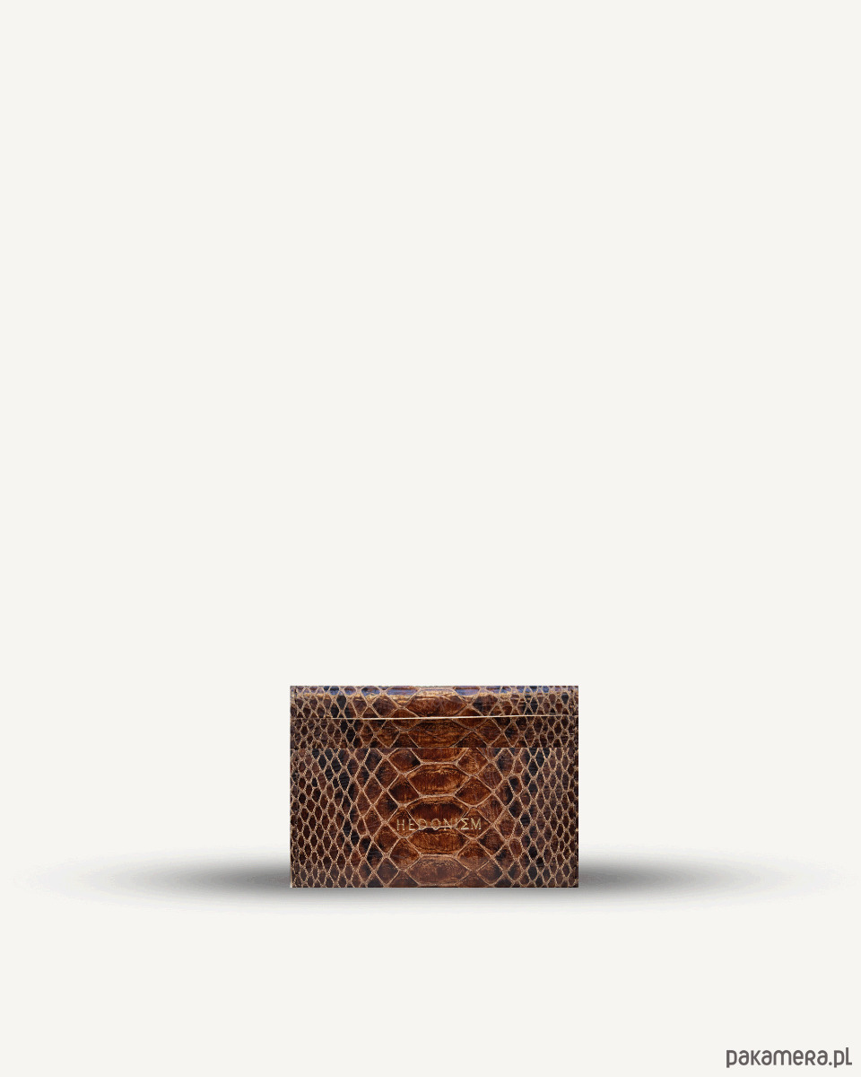 Cardholder ze skóry tłoczonej na wzór węża dostępnej w dwóch kolorach, w połysku z wyczuwalną łuską. Trzy przegródki na karty, gdzie łącznie zmieści się nawet 10 kart. Jedna kieszeń na froncie i dwie kieszenie w przegrodzie zapinanej na nap, co uchroni je przed wysunięciem lub kradzieżą. Napa obciągnięta skórą w tym samym kolorze.