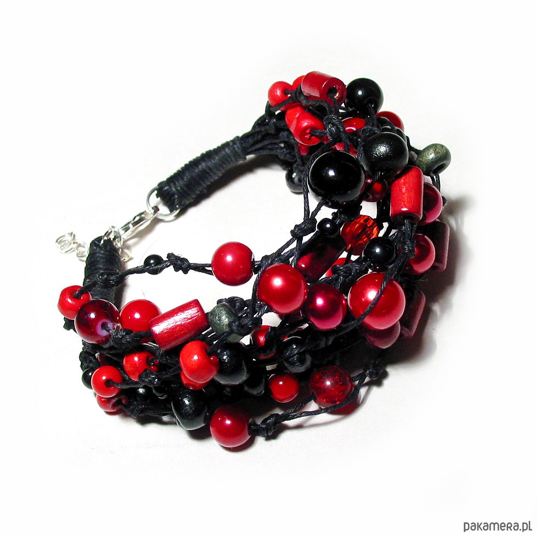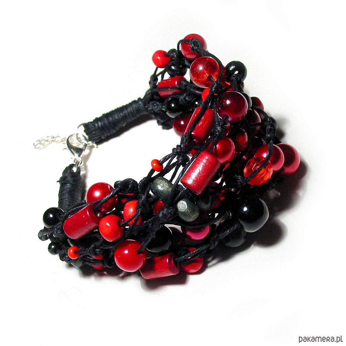 Autorska bransoleta utrzymana w tonacji czerni i soczystych karminów. Powstała na bazie polskiej przędzy lnianej z elementów drewnianych i szklanych.