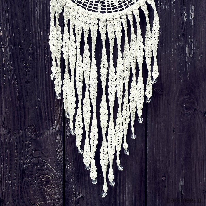 Łapacz snów wykonany jest z merceryzowanej bawełny. Serwetka została napięta na metalowej obręczy. Zawieszka oraz koronki są zdejmowane. Szklane koraliki mienią się i odbijają światło nadając całej ozdobie lekkości.