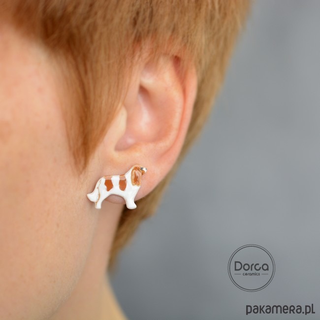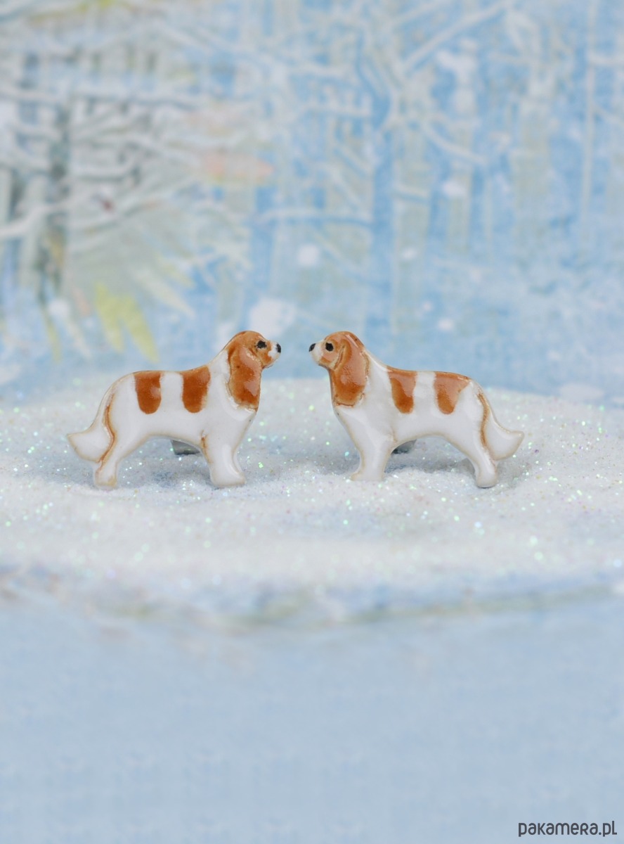 Idealny dodatek dla miłośników rasy cavalier king charles spaniel. Malutkie pieski w rozmiarze : 1,5cm wysokość, 1,9cm szerokość, 1,5mm grubość w kolorystyce biało- rudawej. Kolczyki wykonuję od podstaw ręcznie:) Każda para jest inna:)))) Cavalierki zostały solidnie umocowane na sztyftach ze stali chirurgicznej- antyalergiczna w kolorze oksydowanego srebra. Wysyłam w ozdobnym pudełeczku.