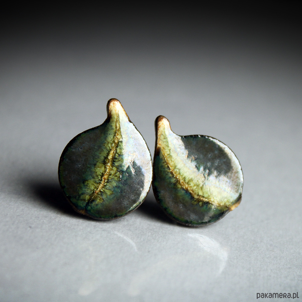 Ceramiczne kolczyki w formie sztyftów, inspirowane motywami biologicznymi, ręcznie wykonane z delikatnej gliny kamionkowej, jednostronnie szkliwione mieszanką beżowych i zielonych szkliw z efektem plamek, na antyalergicznych sztyftach w kolorze srebrnym. Długość ok. 20mm. Polecam